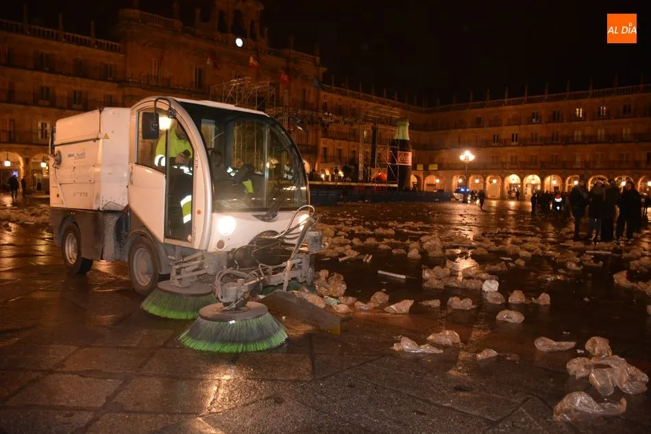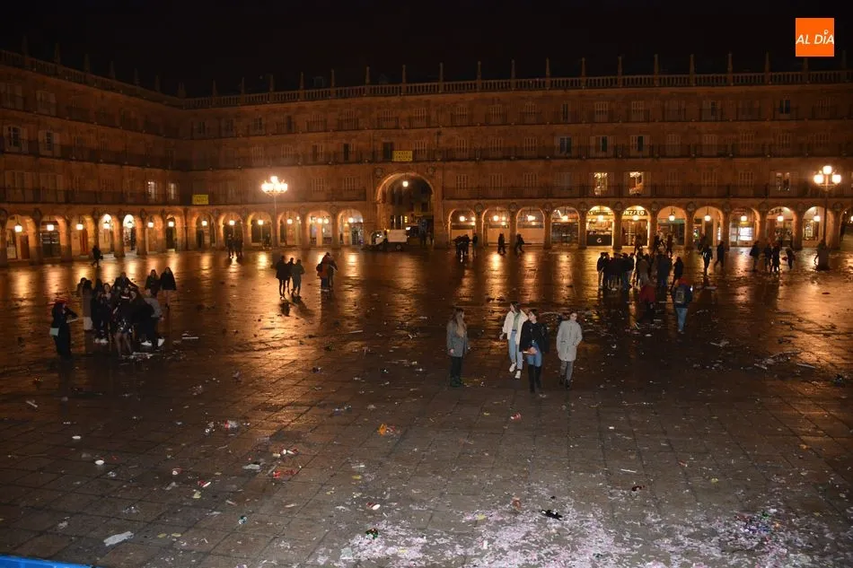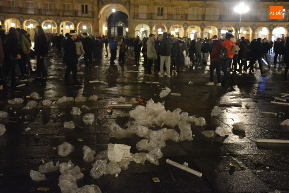 La otra cara de la fiesta del Fin de Año Universitario son kilos y kilos de basura en la Plaza Mayor. Los operarios salmantinos trabajaron a destajo para adecentar el ágora charro tras horas de celebración y alcohol incluido.