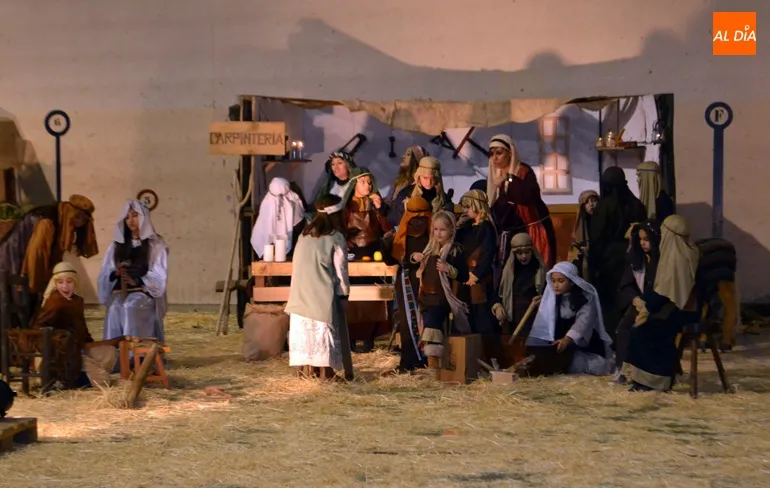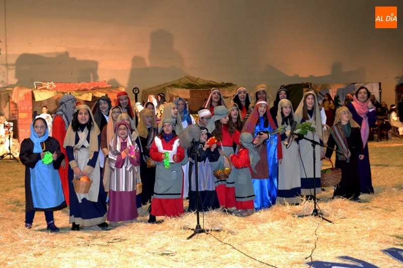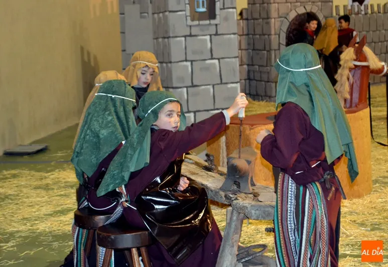 Los villancicos en grupos se mezclaban con la representación de herreros, posaderos o guardias, mientras el gran portal era el epicentro de este montaje, que contaba con la ayuda en su creación de padres y madres de la AMPA del colegio.