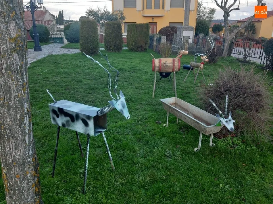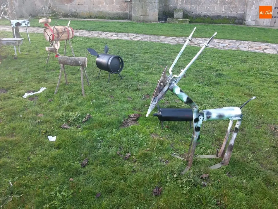Una bombona de butano, un extintor, una vieja reja de arado, el muelle de un amortiguador o un viejo tonel de escabeche son algunos de los elementos que han utilizado en Olmedo de Camaces para confeccionar un insólito belén navideño, estampa tradicional a la que este año han sumado un ingenioso árbol de Navidad, casi artístico, realizado con herraduras y a las que han añadido luces led.