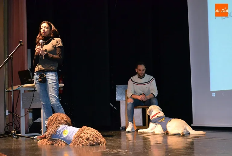 Escolares de los diferentes centros educativos de la ciudad han participado este martes en la charla-exhibición que la Fundación Bocalan ha realizado en el teatro del Centro de Desarrollo Sociocultural, con el fin de presentar la labor diaria que realizan junto a los perros adiestrados para las diferentes terapias sobre las que trabajan.