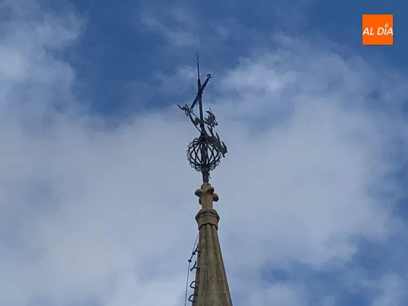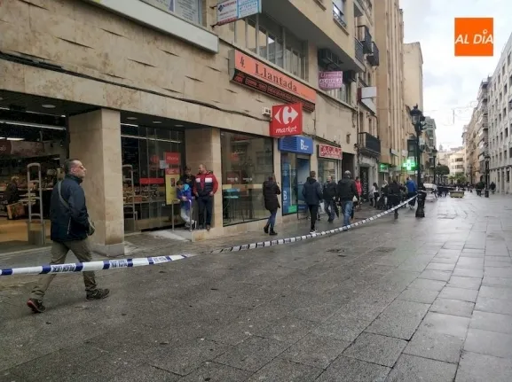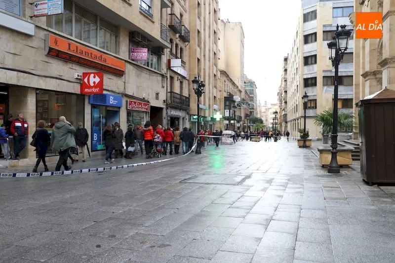 Un tramo de la céntrica calle Toro de Salamanca ha tenido que ser cortado esta mañana por la Policía Local y los Bomberos de Salamanca ante la posibilidad de desprendimiento de la veleta de la iglesia de San Juan de Sahagún.