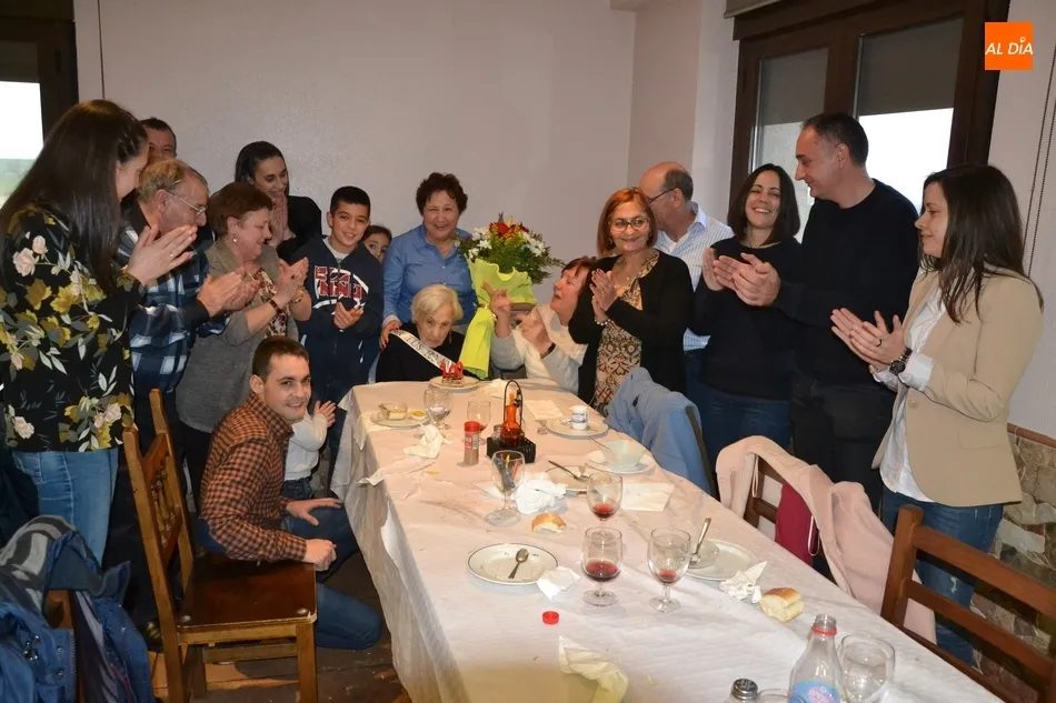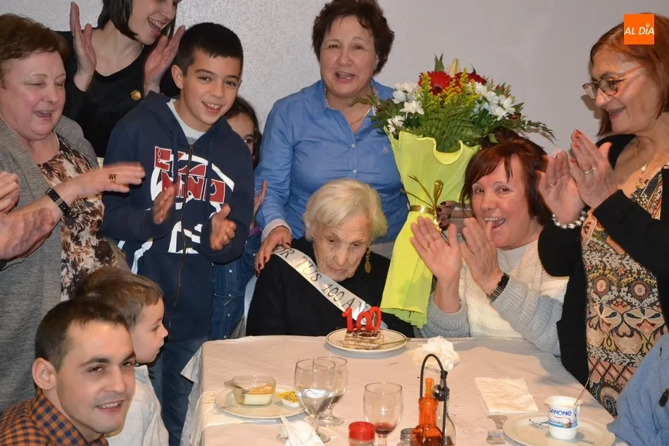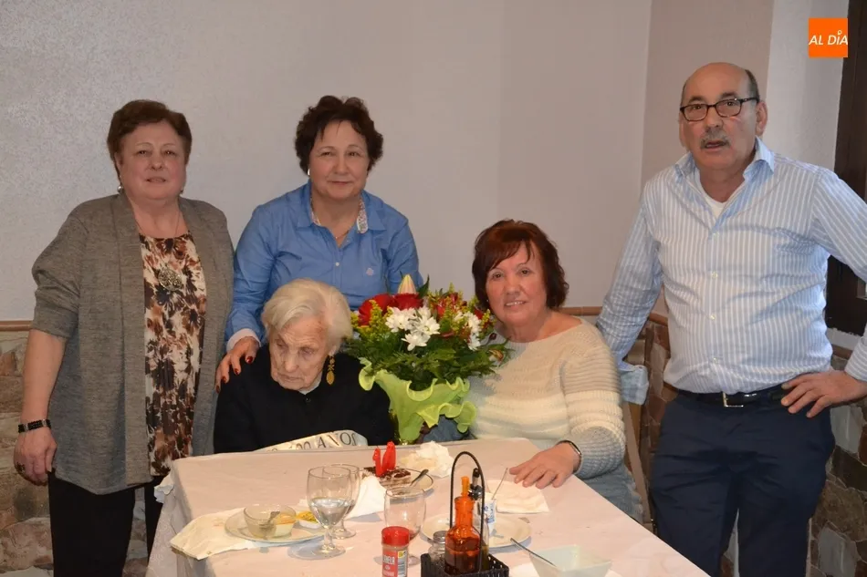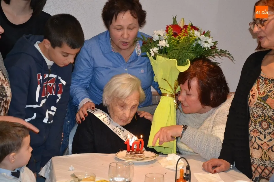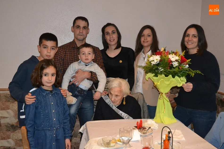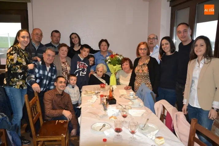 La familia Manzano Palacios de Ciudad Rodrigo se reunió en la jornada del domingo para festejar el 100 cumpleaños de su matriarca, Crescencia Palacios. La celebración consistió en una comida de confraternización, que tuvo lugar en el Restaurante Blanco, donde se dieron cita las distintas generaciones de la familia. En los postres, la cumpleañera (a quién se le colocó una banda distintiva de la efeméride) sopló las velas de una tarta con el 100, esperando toda la familia que pueda hacerlo unos cuantos años más.
