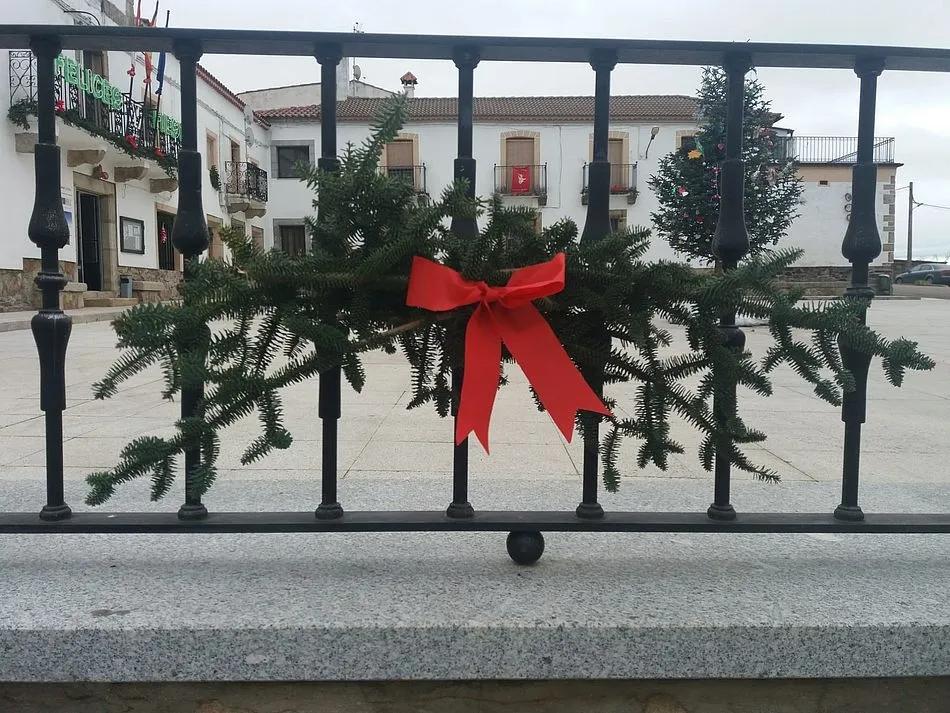 Con estos adornos han decorado la Plaza Mayor del pueblo, colocando los adornos en torno al ágora y en las ventanas y balcones de la misma, utilizando también ramas de abeto y lazos.