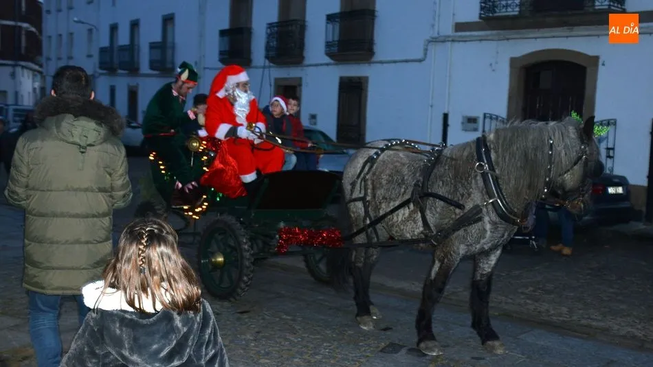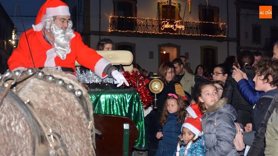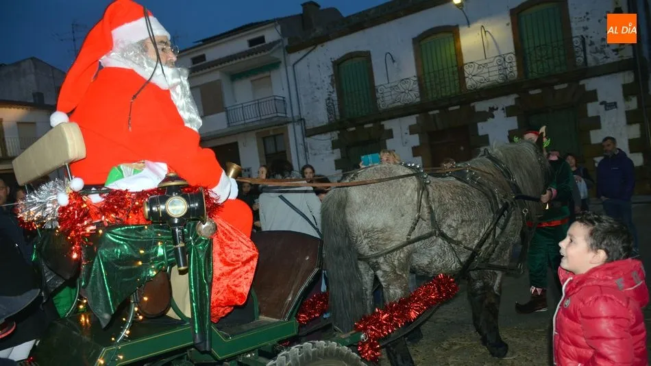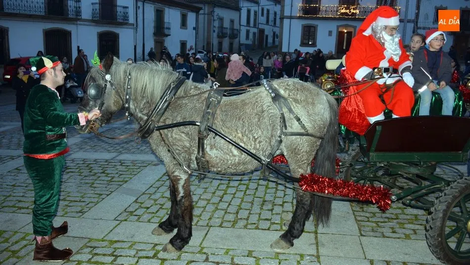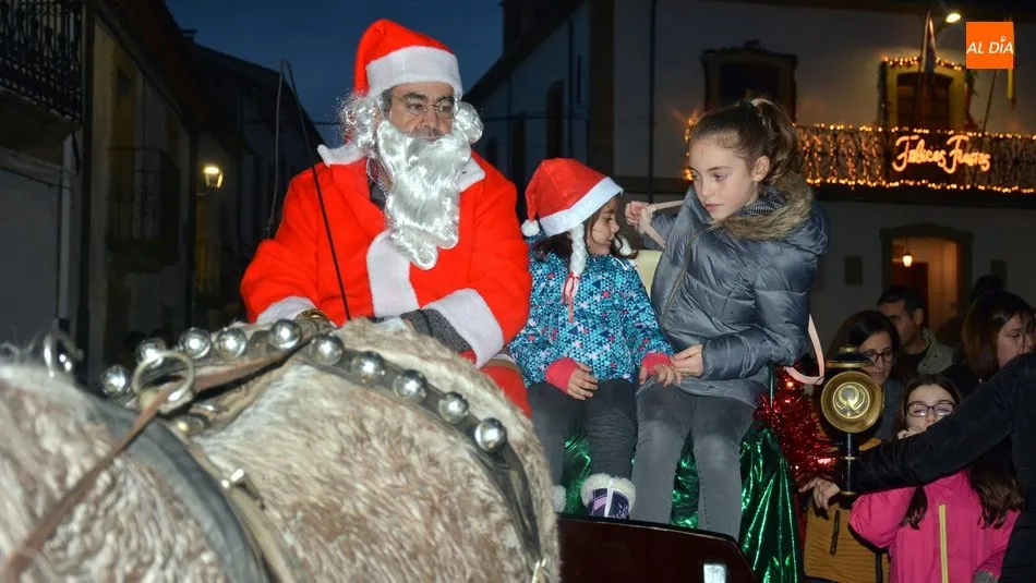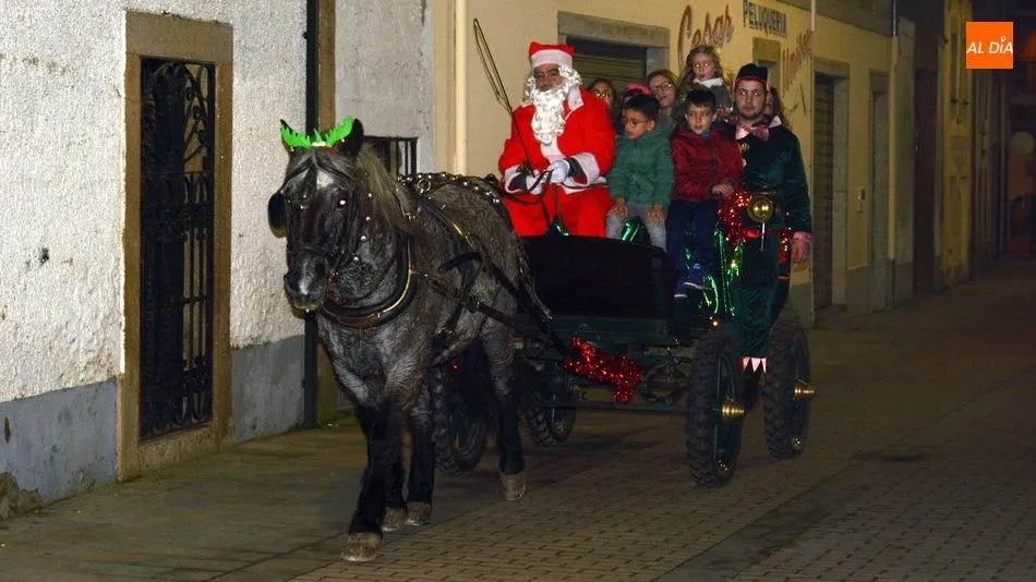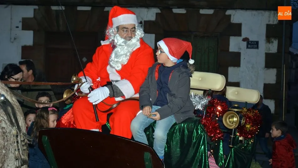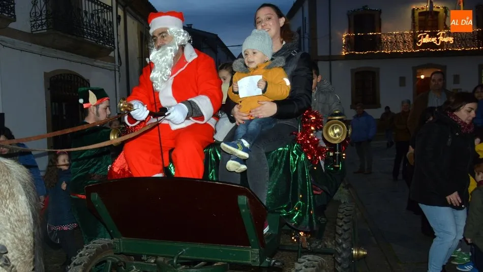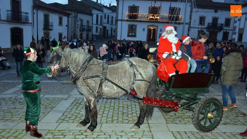Papa Noel ha llegado esta tarde a bordo de una carroza a la Plaza Mayor de Lumbrales dónde le esperaban, con enorme ilusión y muchos nervios, muchos niños, acompañados de sus padres y abuelos. Los pequeños fueron invitados a dar un paseo por las calles del pueblo a bordo de la carroza de la que tiraba un fuerte caballo percherón y que conducida por el propio Papá Noel al que acompañaba un elfo.