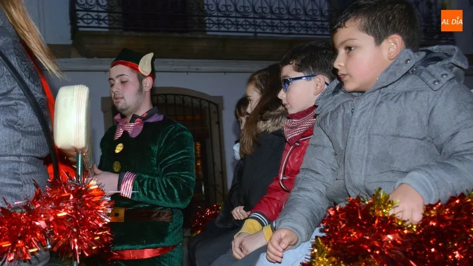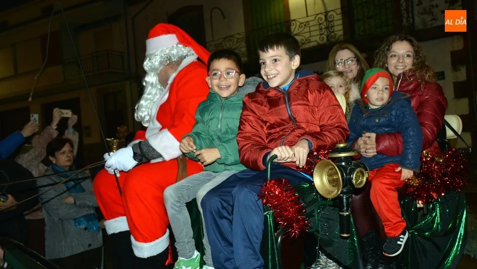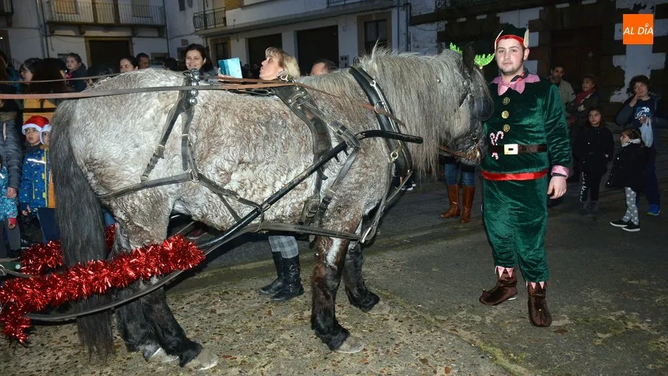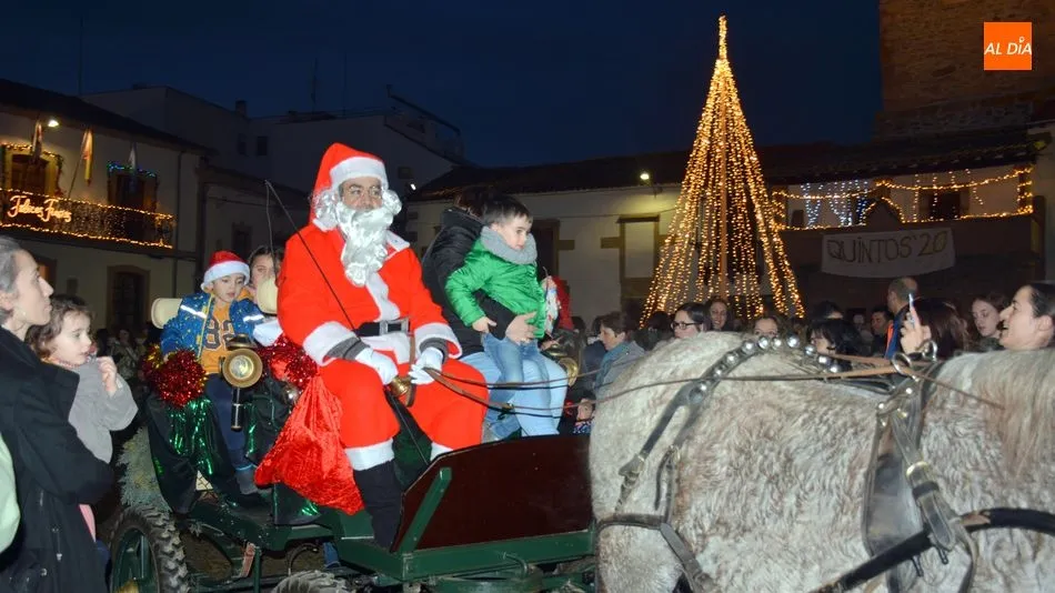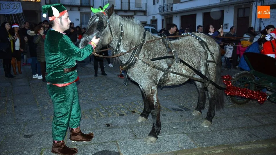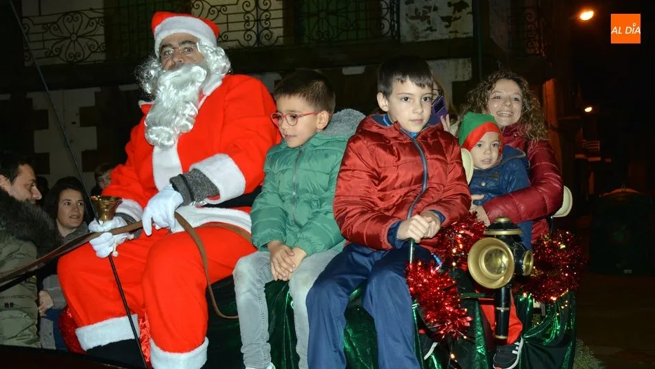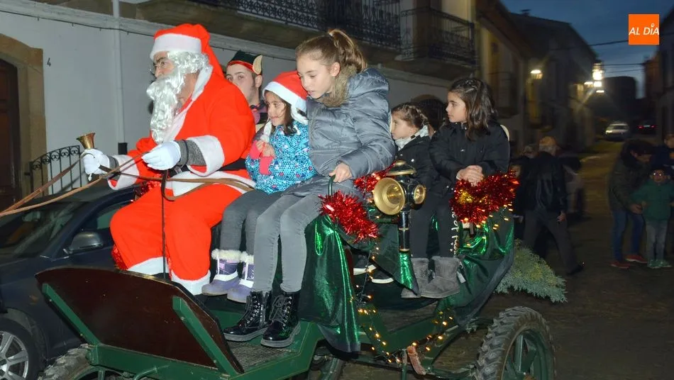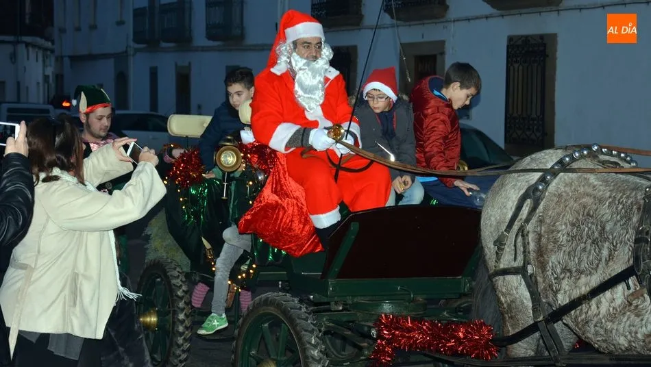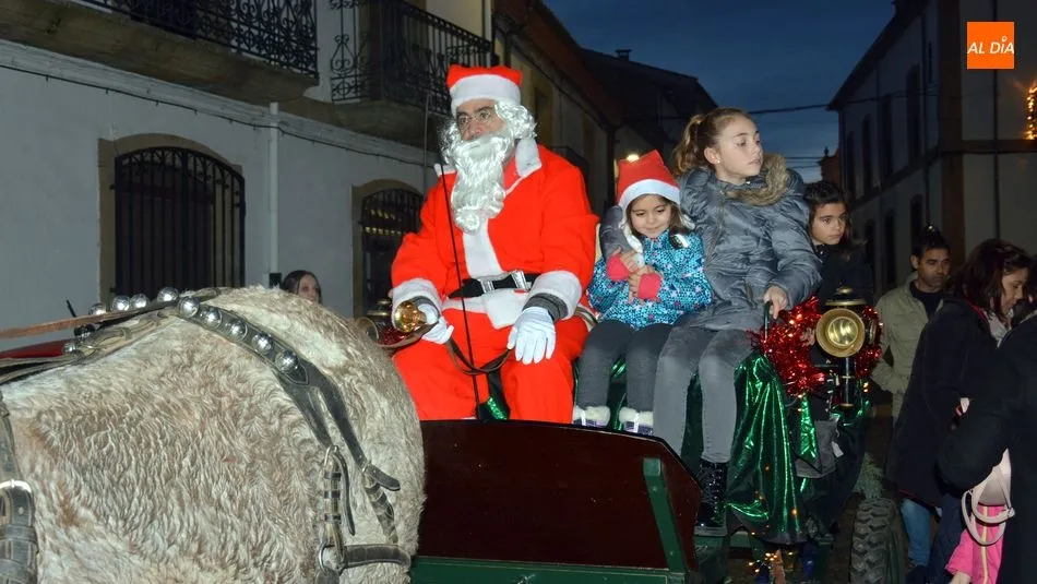 Papa Noel ha llegado esta tarde a bordo de una carroza a la Plaza Mayor de Lumbrales dónde le esperaban, con enorme ilusión y muchos nervios, muchos niños, acompañados de sus padres y abuelos. Los pequeños fueron invitados a dar un paseo por las calles del pueblo a bordo de la carroza de la que tiraba un fuerte caballo percherón y que conducida por el propio Papá Noel al que acompañaba un elfo.