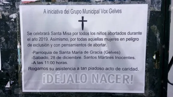 Vox también preveía llevar a cabo este 28 de diciembre una misa en el municipio sevillano de Gelves, en la parroquia Santa María de Gracia, por "los niños abortados durante 2019" y por "todas aquellas mujeres en peligro de exclusión y con pensamientos de abortar", que finalmente ha sido suspendida por parte de la Iglesia.