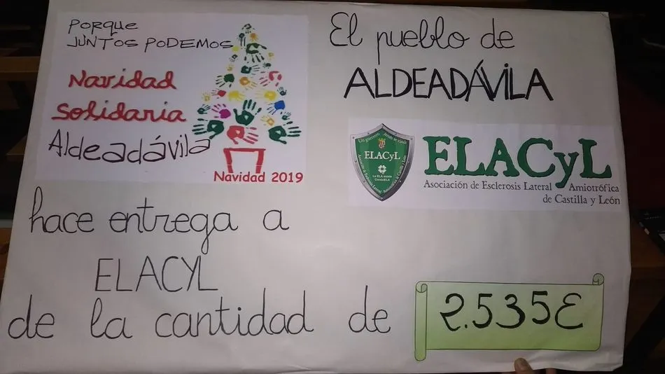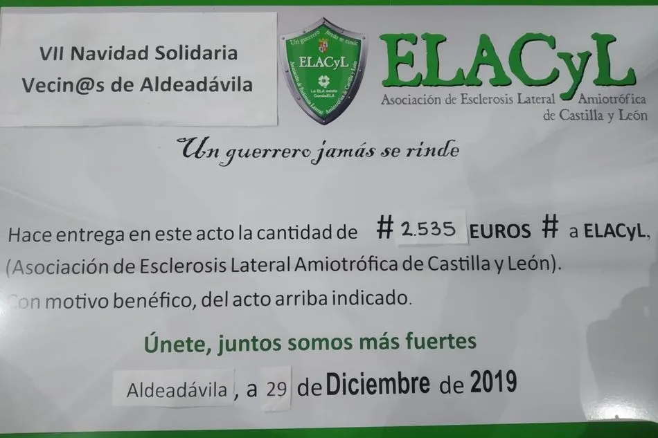 Esta actuación tendría lugar en la iglesia parroquial del Salvador a las 18.00 horas con una buena entrada. El precio para el concierto de Navidad era de 2 euros, que junto con lo recaudado en la paella, en total los vecinos de Aldeadávila hacían entrega a la Asociación ELACyL de 2.535 euros.