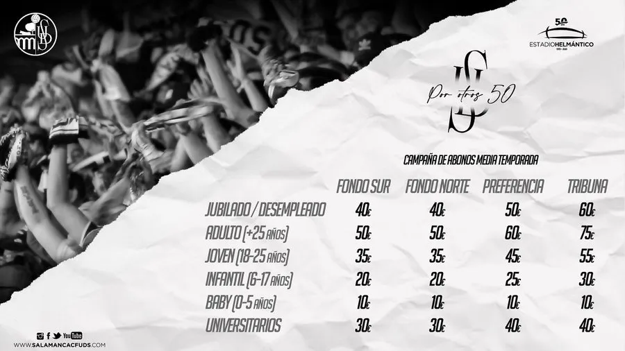 A partir del próximo dos de enero, todos aquellos aficionados que lo deseen podrán abonarse al Salamanca UDS cara a la segunda vuelta, en la que podrán vivir una decena de encuentros de máximo nivel en el mejor escenario, el Helmántico, que cumple 50 años y donde más de 6.000 abonados disfrutan ya cada quince días.
