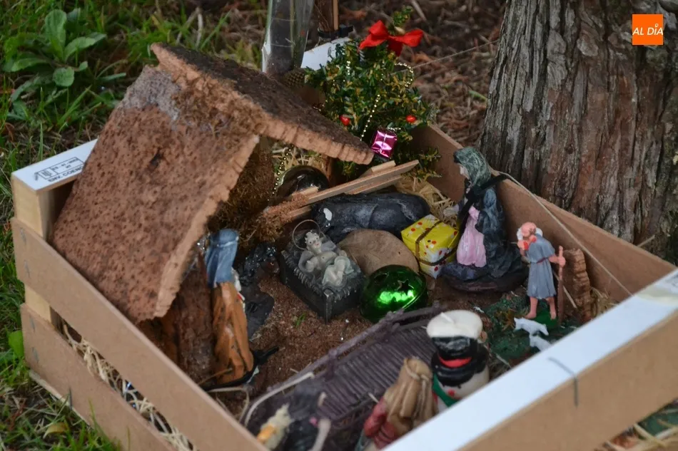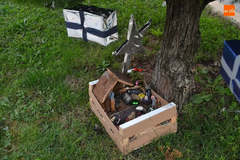 Por un lado, estas cajas llenan el parque infantil de la calle, colgando tanto del árbol que hay en el centro, que han vuelto a vestir de Navidad, como de los diversos juegos infantiles del mismo. Por cierto, que en lo más alto del árbol se ha colocado una Estrella de Belén mientras que a sus pies luce un nacimiento dentro de una caja.