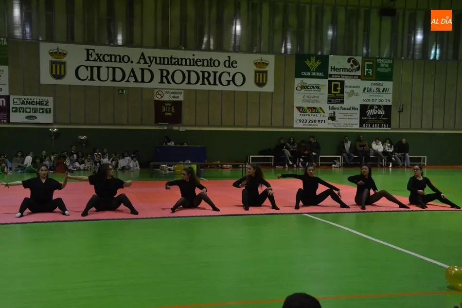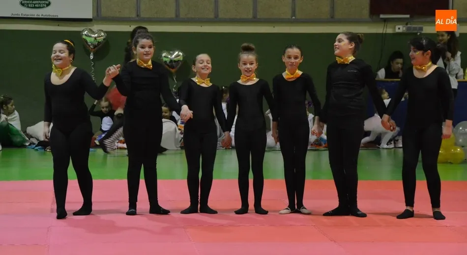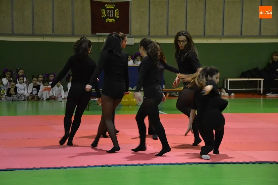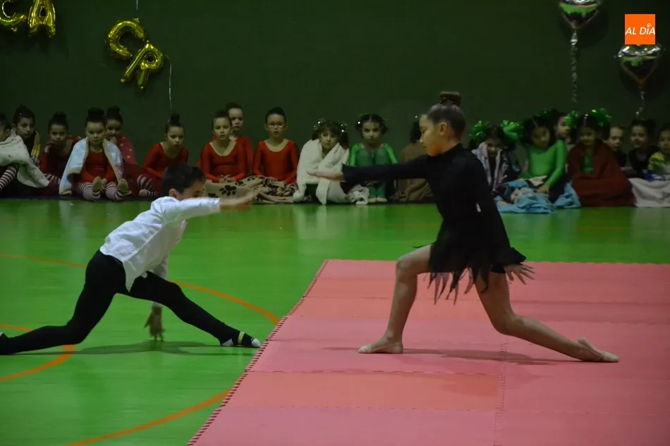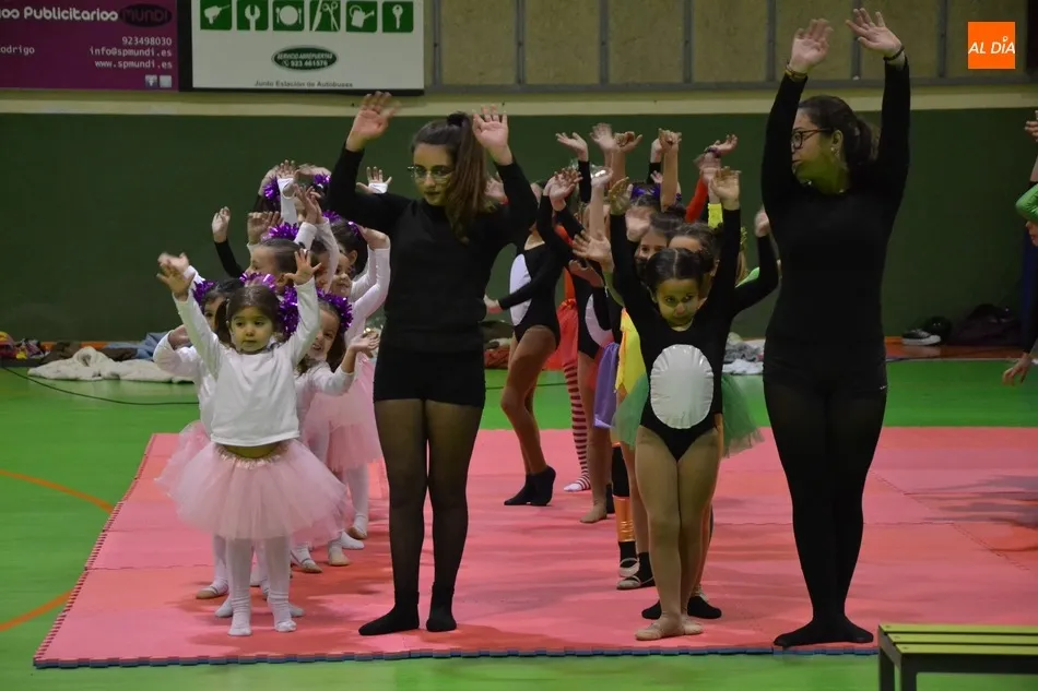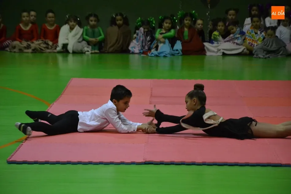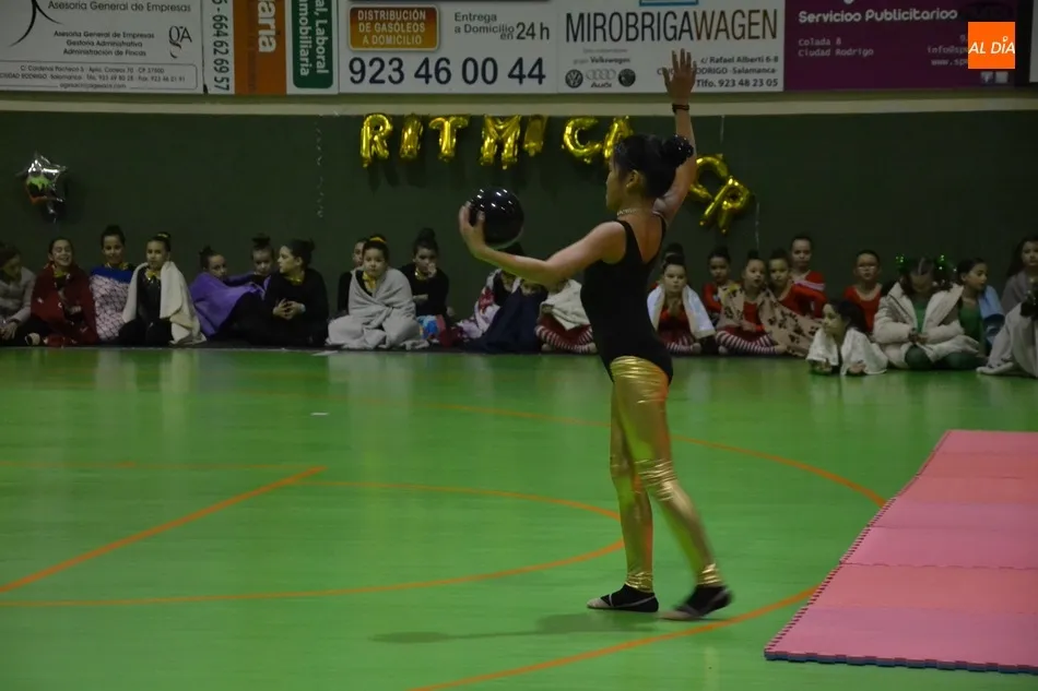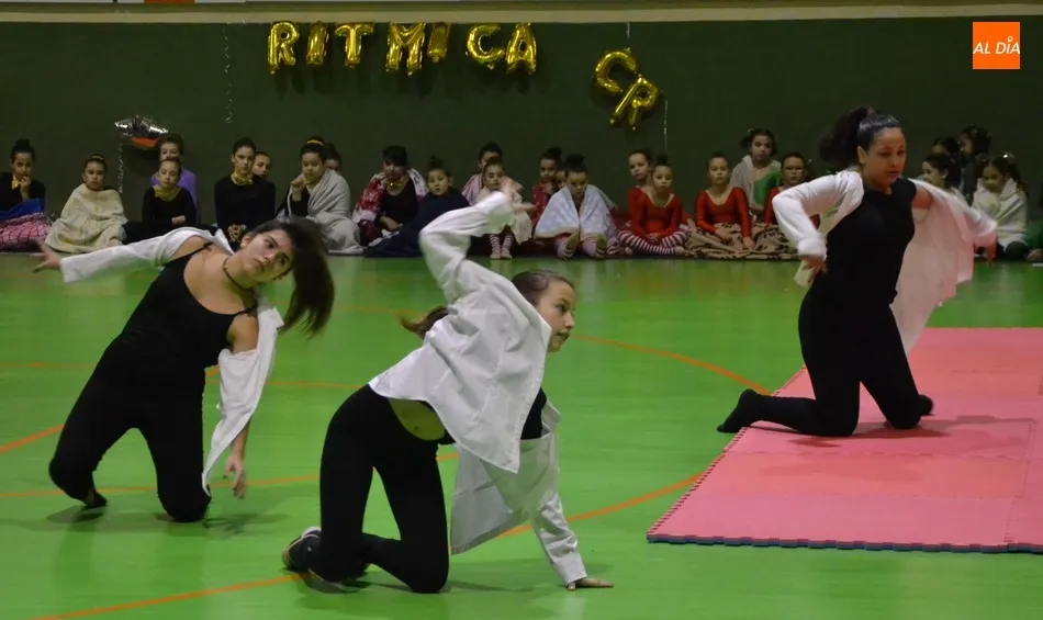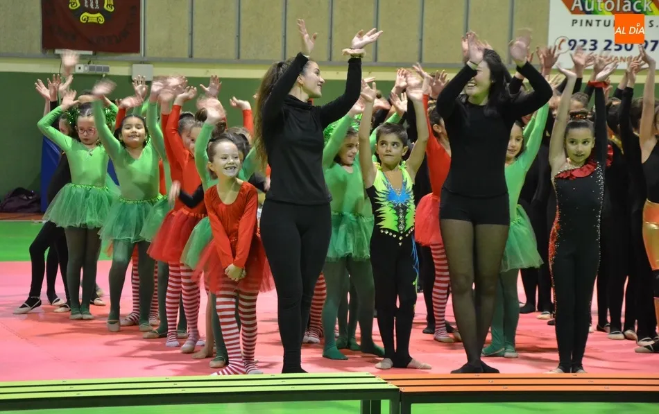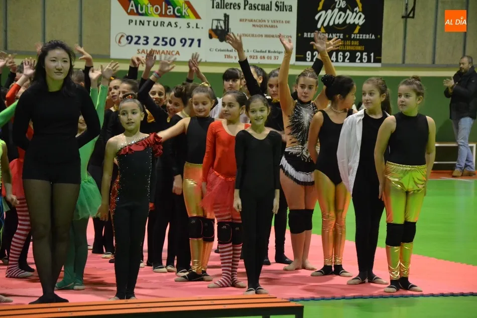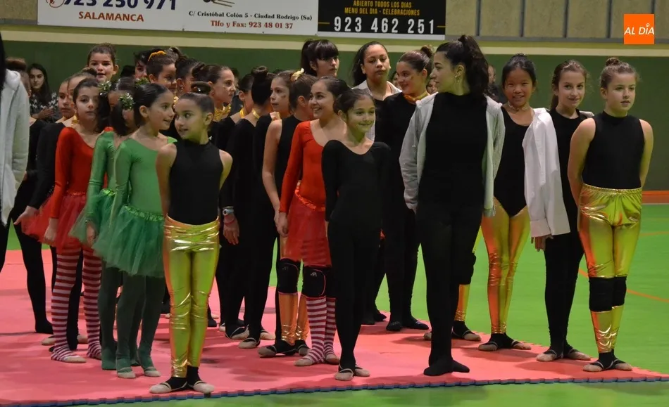 De sus 106 integrantes, en la exhibición participaron unos 96 (todos ellos chicas menos un niño), que dieron lo mejor de sí mismos, ataviados de forma apropiada para la ocasión, incluido con toques navideños (en concreto, partes de tiras de espumillón enrolladas en los moños). Junto a los alumnos de la Escuela, la exhibición contó con la intervención sobre el tapiz de sus responsables, Alicia Cid y Lucía de Elías, y otras veteranas de la gimnasia rítmica en Ciudad Rodrigo.