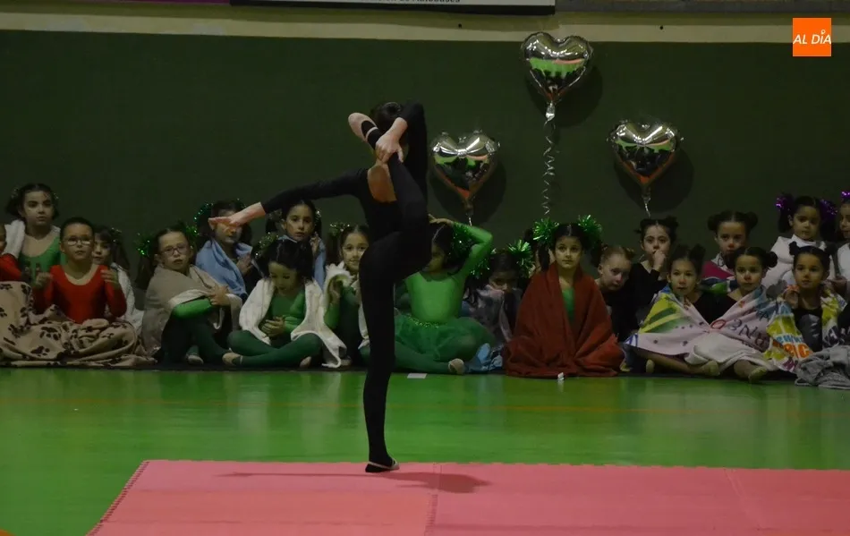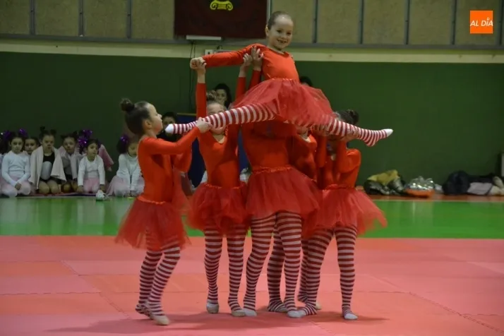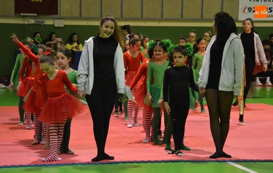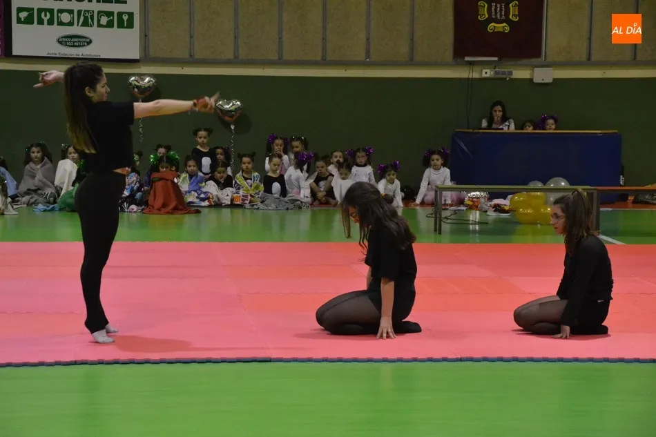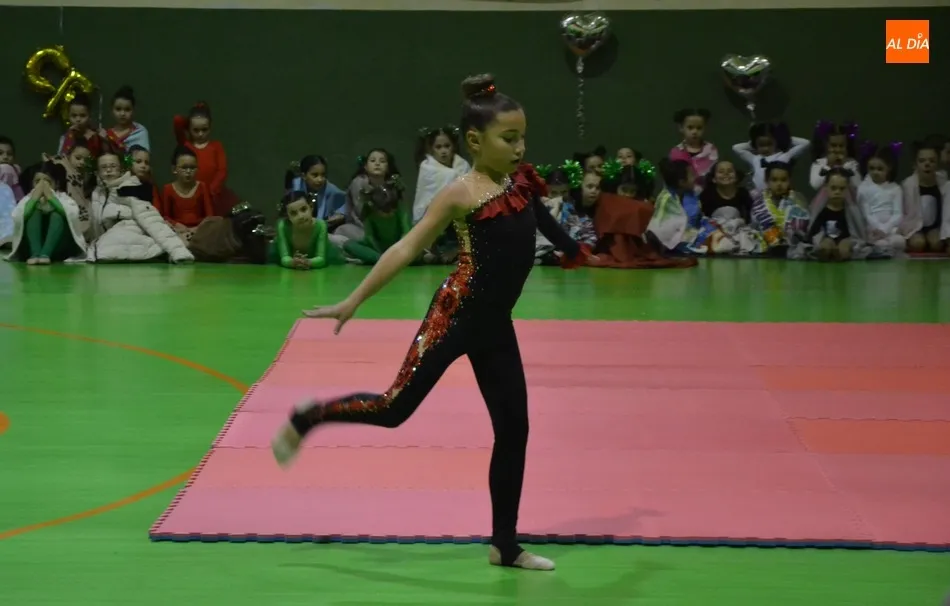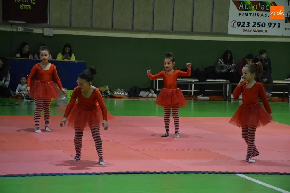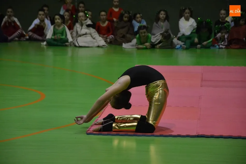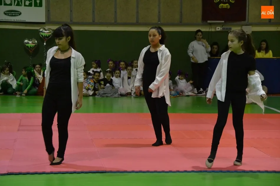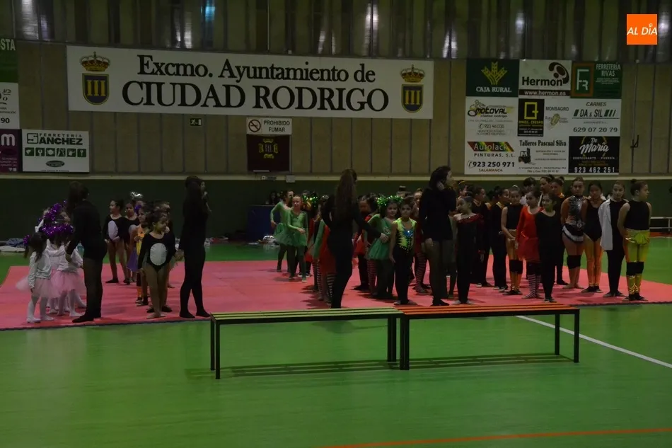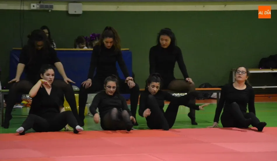 De sus 106 integrantes, en la exhibición participaron unos 96 (todos ellos chicas menos un niño), que dieron lo mejor de sí mismos, ataviados de forma apropiada para la ocasión, incluido con toques navideños (en concreto, partes de tiras de espumillón enrolladas en los moños). Junto a los alumnos de la Escuela, la exhibición contó con la intervención sobre el tapiz de sus responsables, Alicia Cid y Lucía de Elías, y otras veteranas de la gimnasia rítmica en Ciudad Rodrigo.