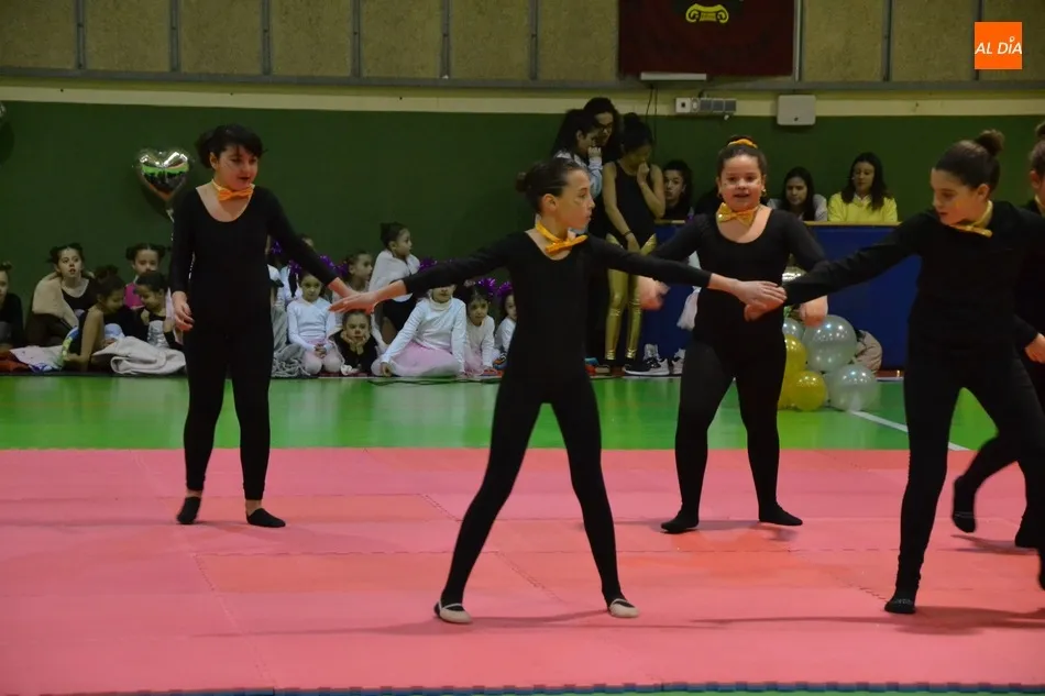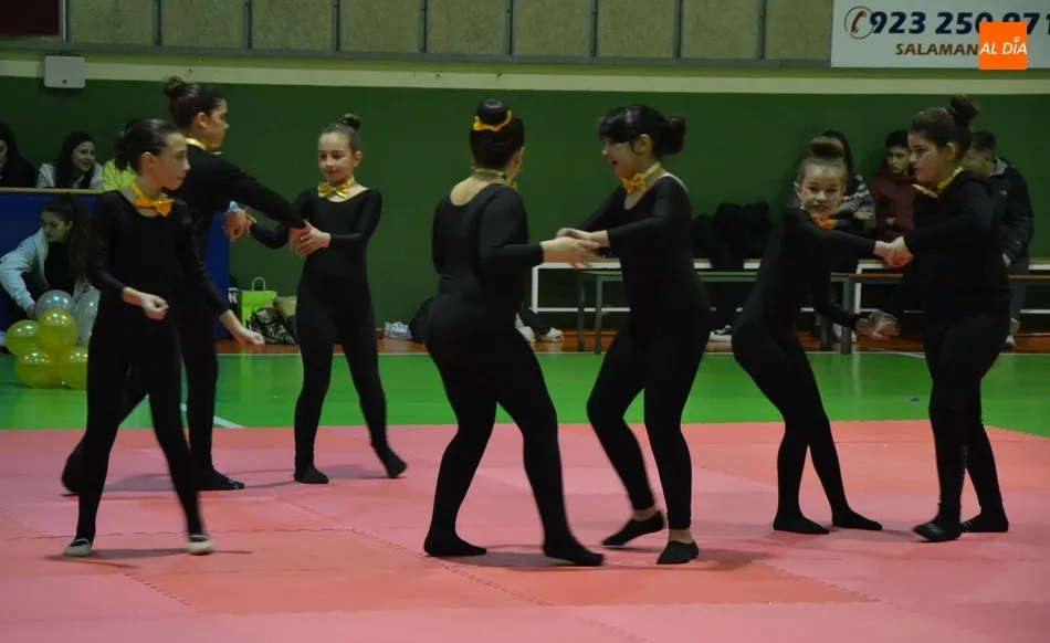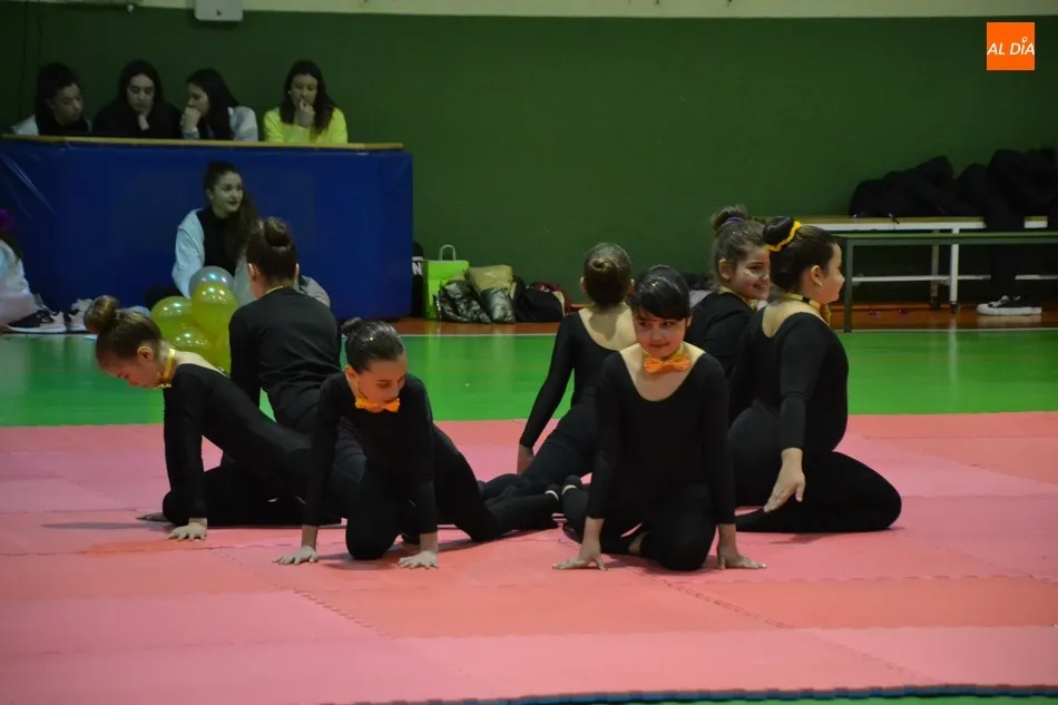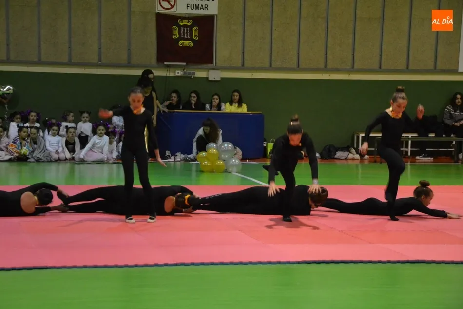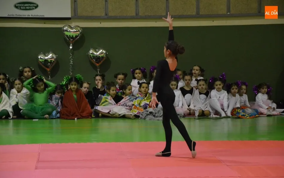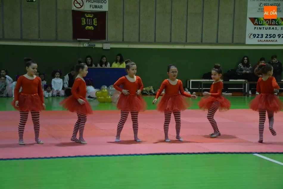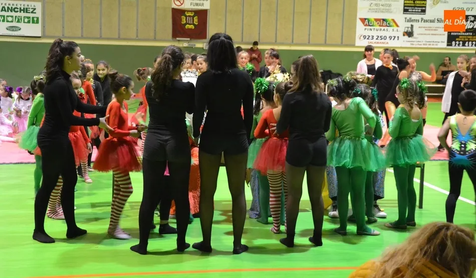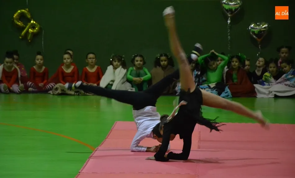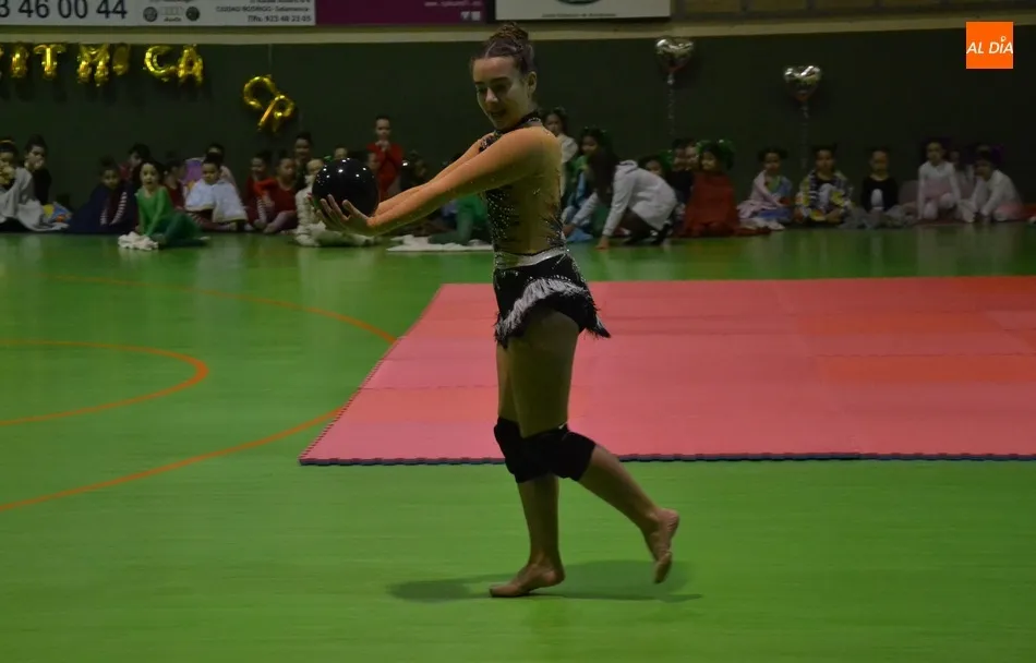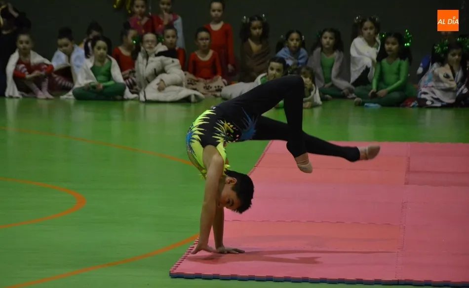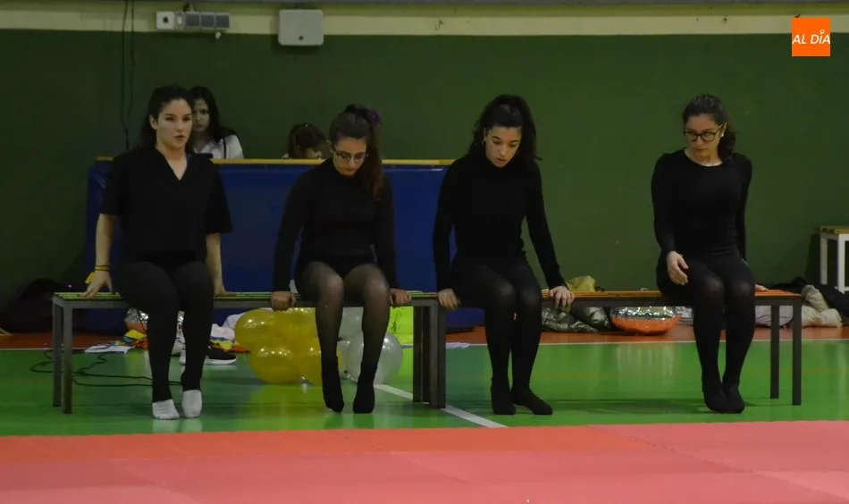 De sus 106 integrantes, en la exhibición participaron unos 96 (todos ellos chicas menos un niño), que dieron lo mejor de sí mismos, ataviados de forma apropiada para la ocasión, incluido con toques navideños (en concreto, partes de tiras de espumillón enrolladas en los moños). Junto a los alumnos de la Escuela, la exhibición contó con la intervención sobre el tapiz de sus responsables, Alicia Cid y Lucía de Elías, y otras veteranas de la gimnasia rítmica en Ciudad Rodrigo.