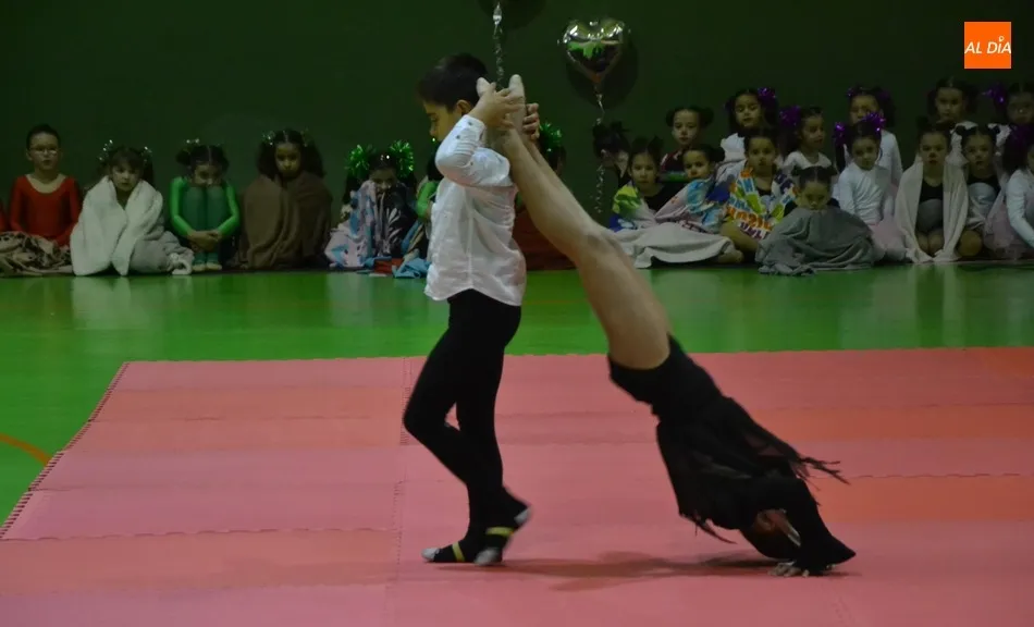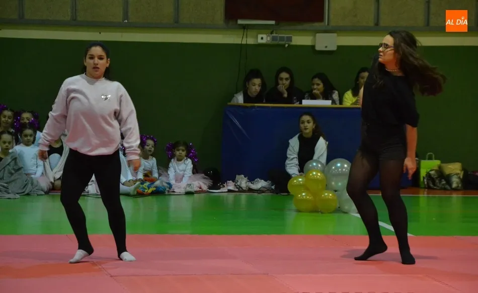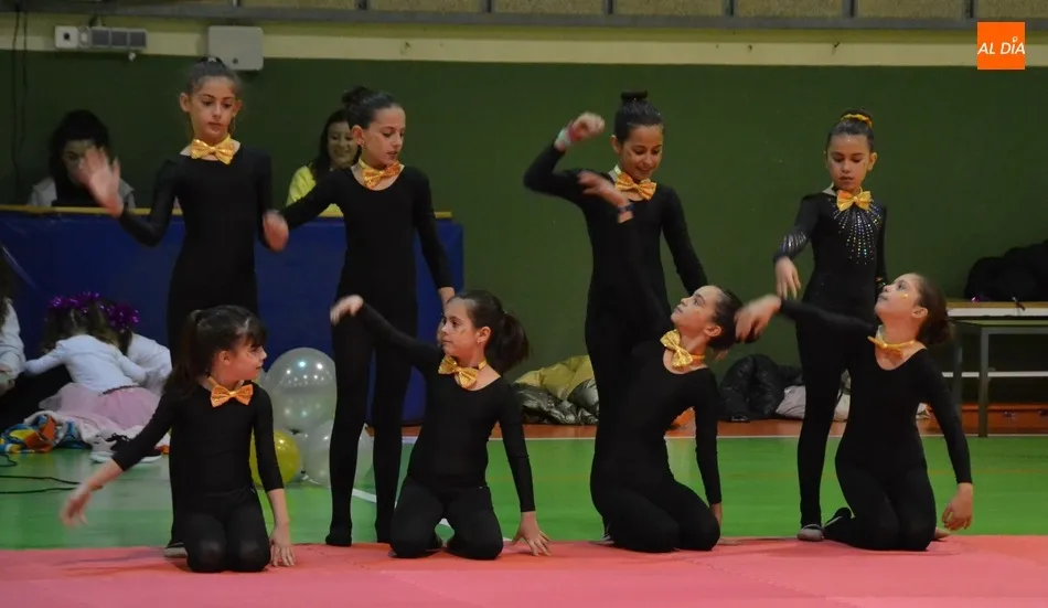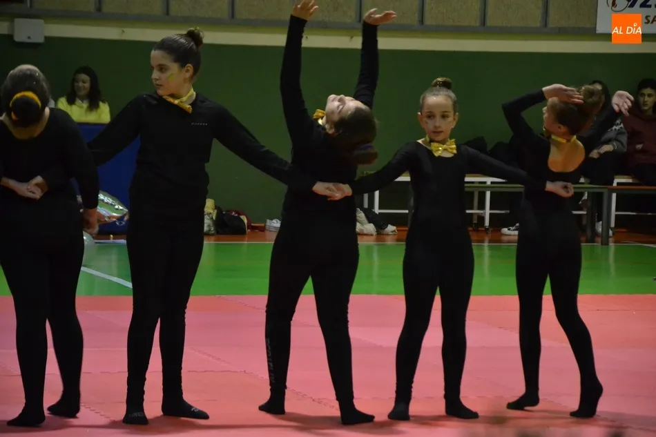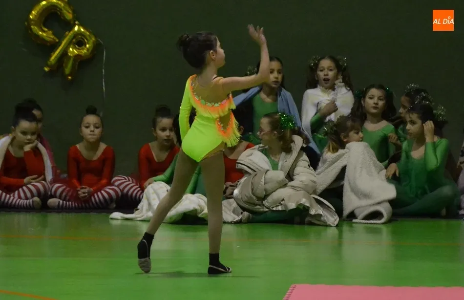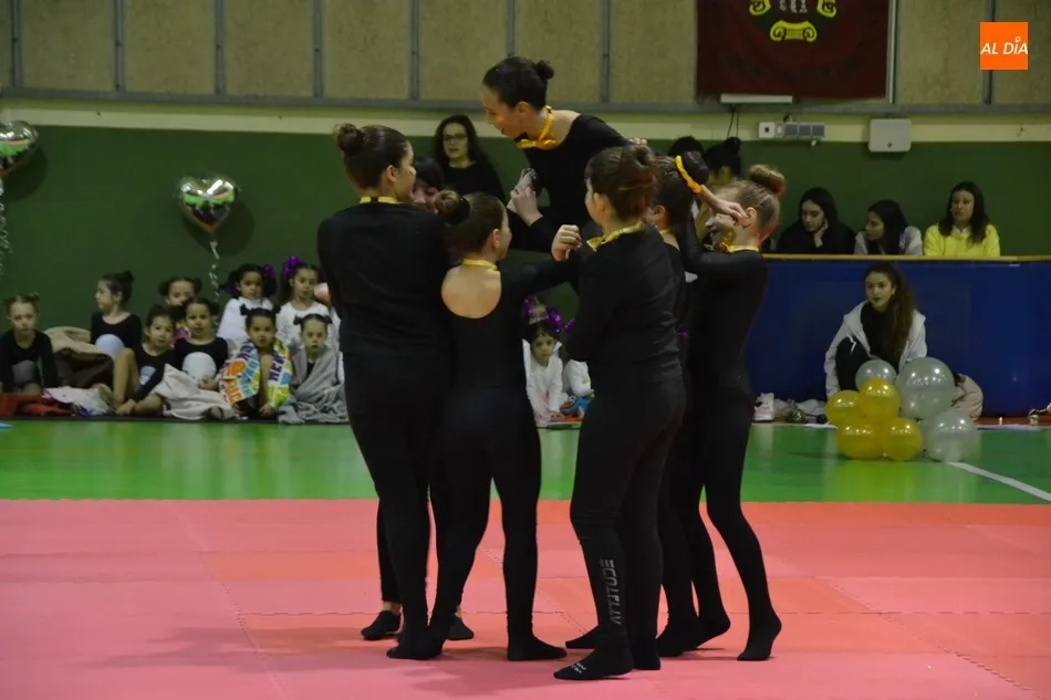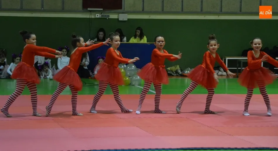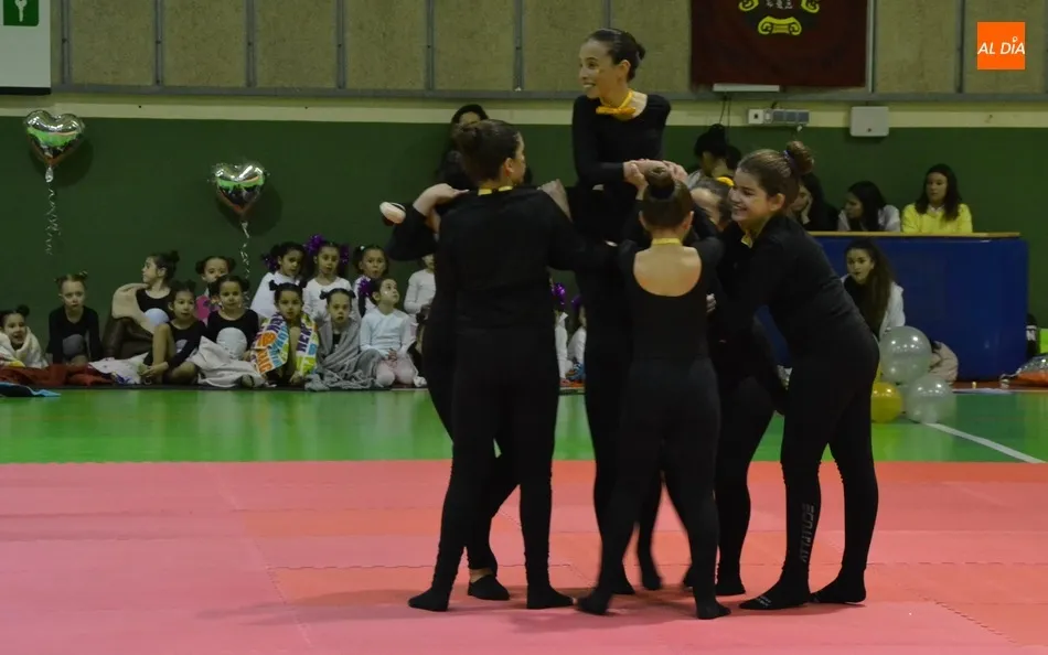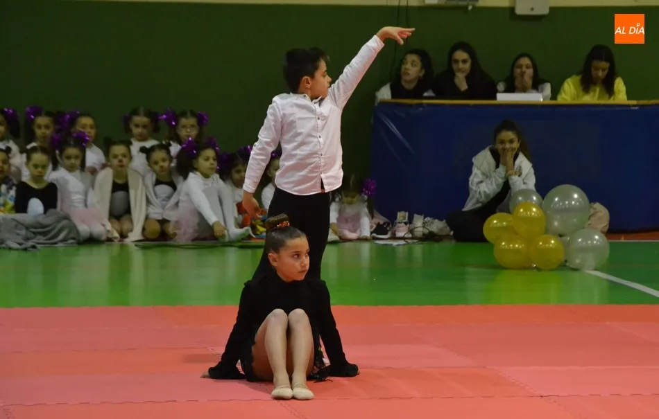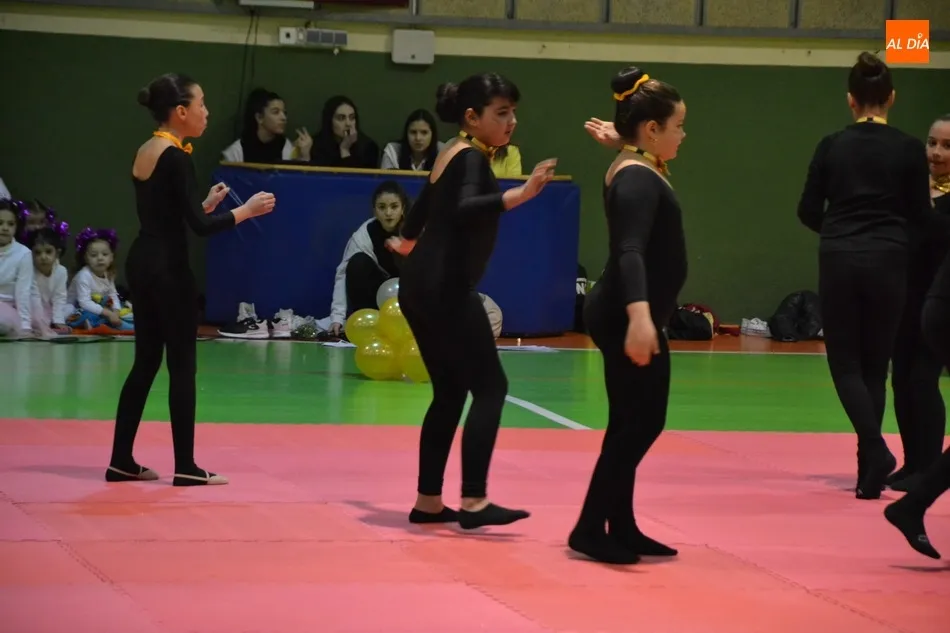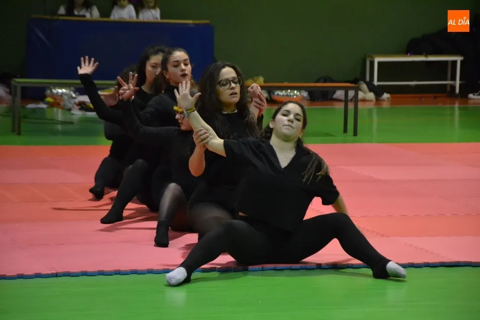 De sus 106 integrantes, en la exhibición participaron unos 96 (todos ellos chicas menos un niño), que dieron lo mejor de sí mismos, ataviados de forma apropiada para la ocasión, incluido con toques navideños (en concreto, partes de tiras de espumillón enrolladas en los moños). Junto a los alumnos de la Escuela, la exhibición contó con la intervención sobre el tapiz de sus responsables, Alicia Cid y Lucía de Elías, y otras veteranas de la gimnasia rítmica en Ciudad Rodrigo.