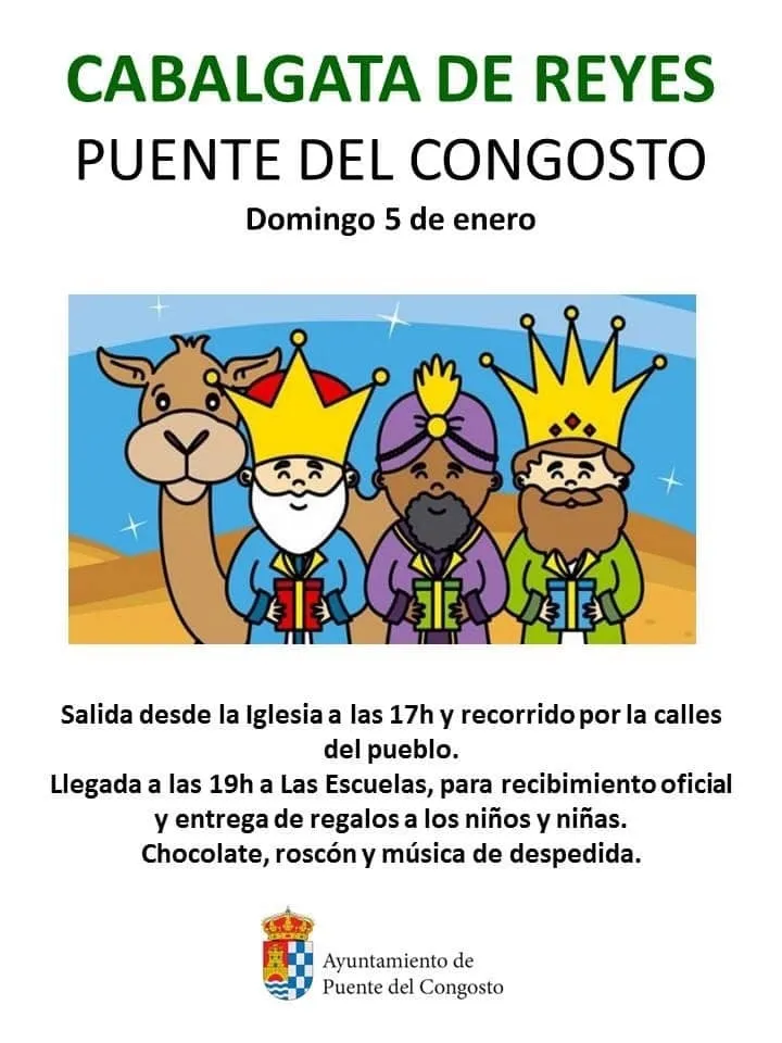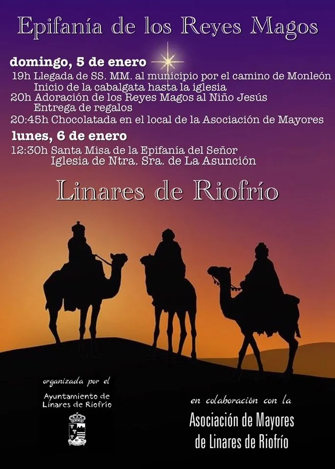 Los Reyes Magos llegarán por el camino de Monleón y marcharán hasta la iglesia, donde comenzará la cabalgata. A las 20:00 horas tendrá lugar la adoración de los Reyes Magos al niño Jesús y se procederá a la entrega de regalos en el templo. A las 20:45 se ofrecerá una chocolatada en el hogar del jubilado. El lunes, 6 de enero, se oficiará la misa de la Epifanía del Señor en la iglesia parroquial.