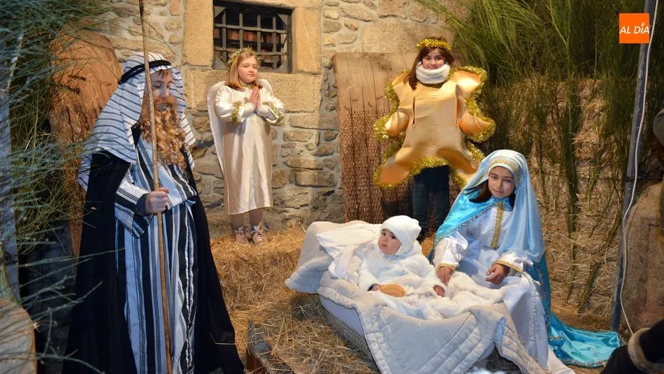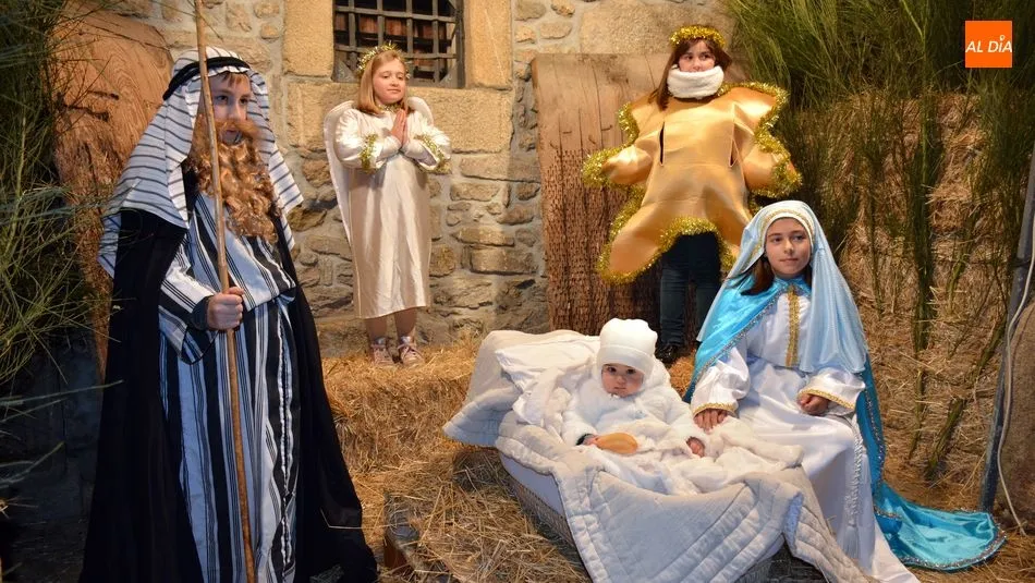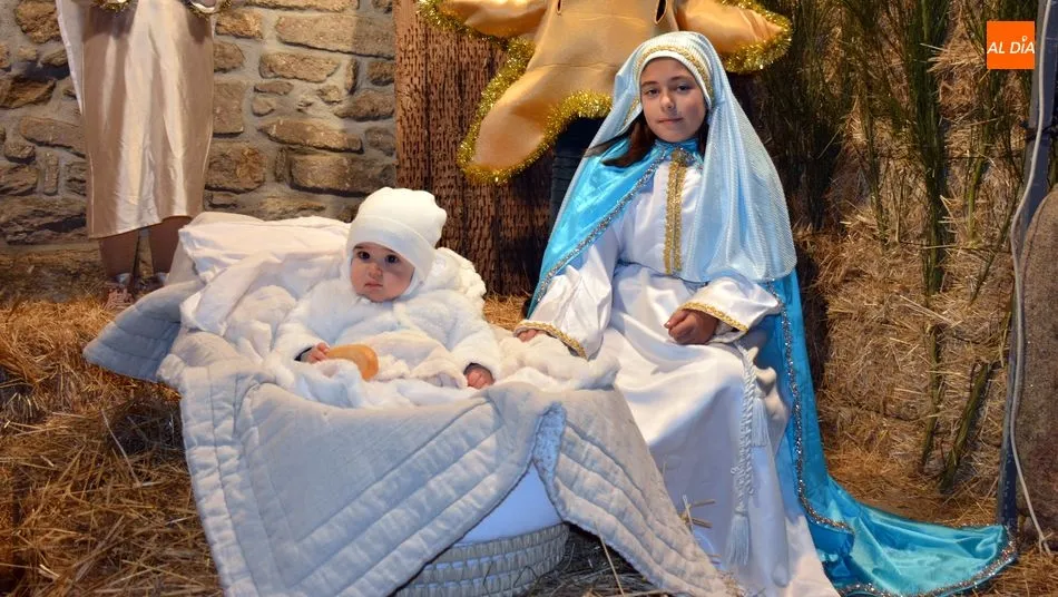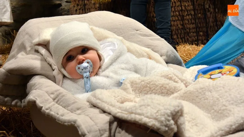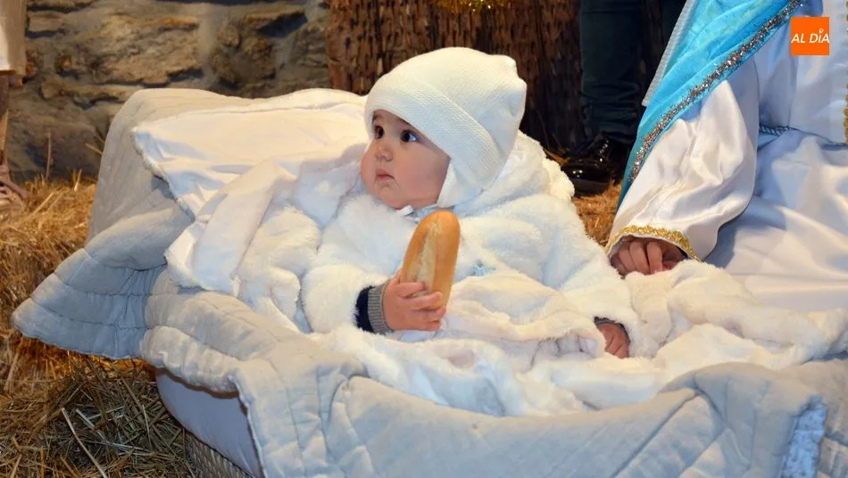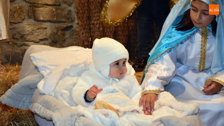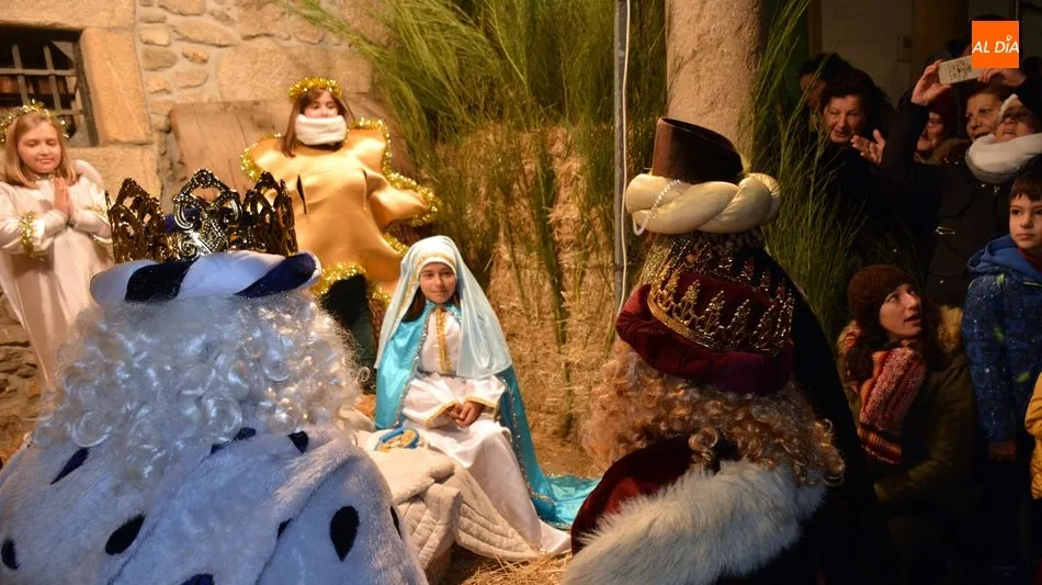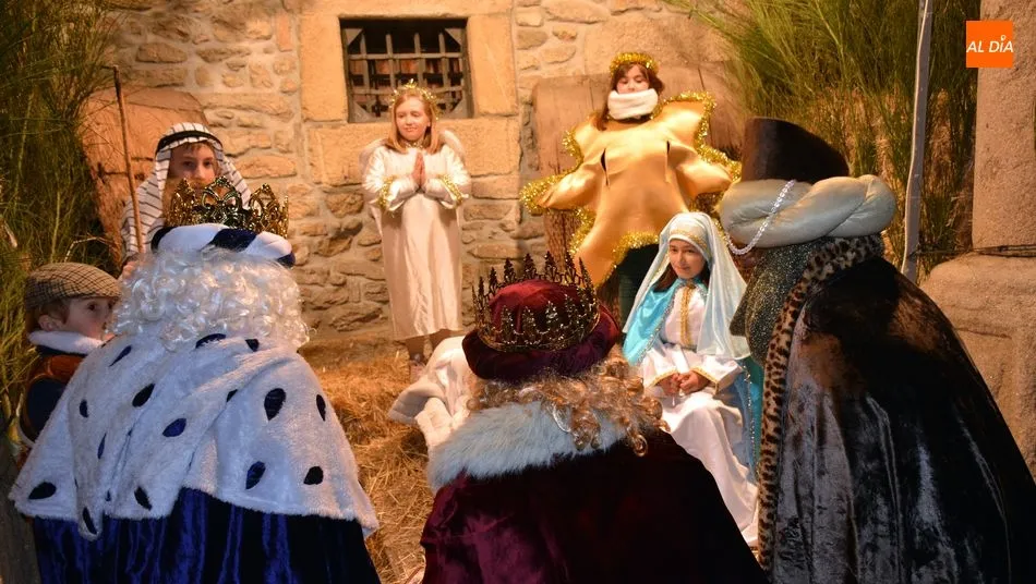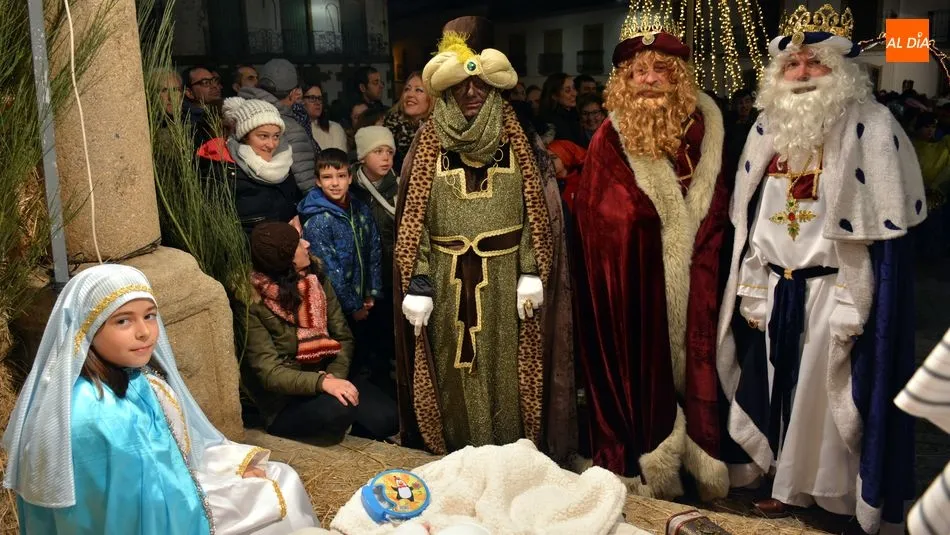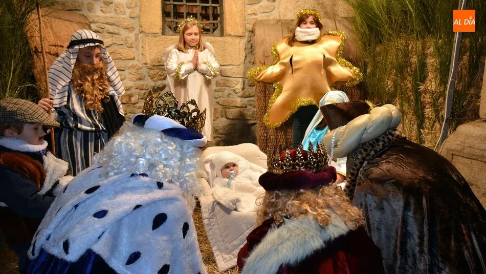 Una vez llegados a la Plaza Mayor, sus Majestades de Oriente dejaron sus carrozas y se acercaron al soportal de la Torre del Reloj, donde visitaron el Belén Viviente del que formaban parte unos muy jóvenes Virgen María, San José, un ángel y una estrella y un hermoso bebé que miraba con atención a los Reyes que le ofrecieron los tradicionales presentes de oro, incienso y mirra.