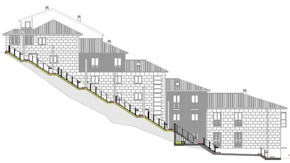 Teniendo en cuenta el ancho de cuatro metros definido por el muro de cerramiento y la fachada de la edificación limítrofe, así como la diferencia de cota de 16,2 metros y la longitud de 42 metros en proyección horizontal, se ha proyectado una escalera con un ancho de 1,40 en nueve tramos con sus correspondientes mesetas de 1,40 metros.