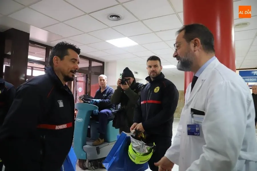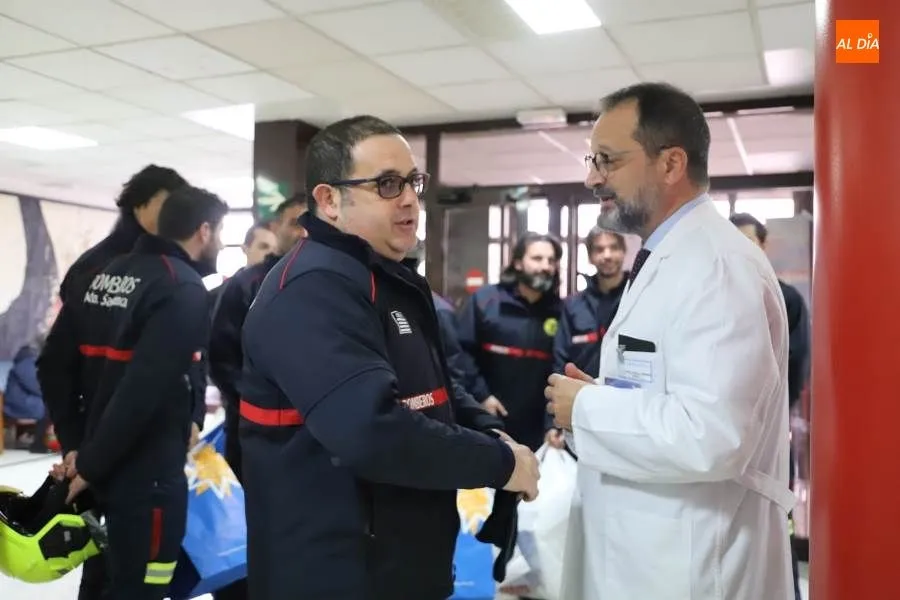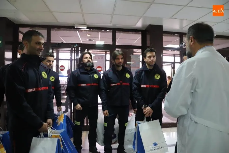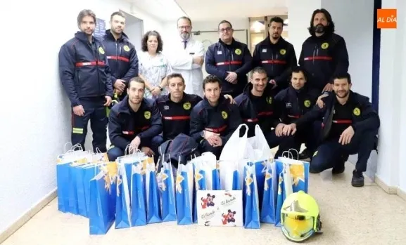 Un grupo de Bomberos del Servicio de Prevención, Extinción de Incendios y Salvamentos de Salamanca ha visitado este miércoles a los menores hospitalizados en el Clínico Universitario, a los que han llevado regalos donados por la Confederación de Empresas de Salamanca (CES).