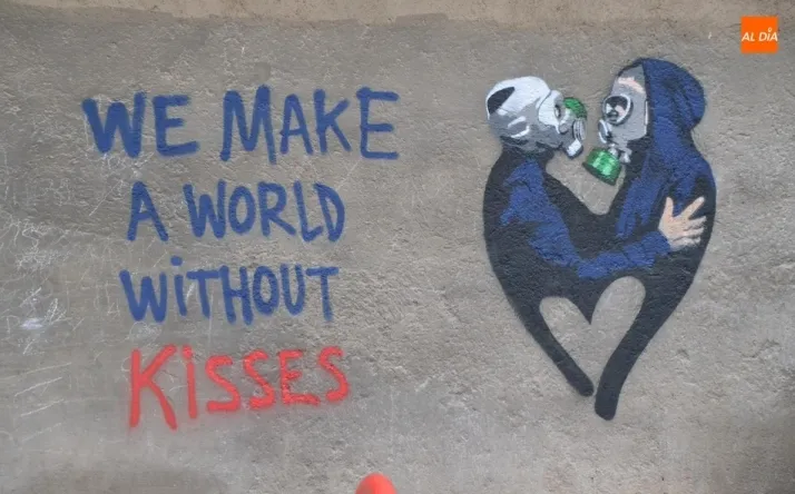 Como se puede ver en las imágenes, en su parte derecha aparecen dos personas ?intentando besarse? con máscaras antigás puestas (conformando un corazón en su parte inferior), mientras que en la parte izquierda figura la leyenda ?We make a world without kisses?, es decir ?Hacemos un mundo sin besos?. Aunque no hay ninguna explicación, parece que el grafiti reivindica justo lo contrario, que, teniendo en cuenta la situación actual, haya más besos en el mundo.