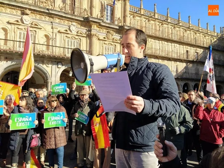 Con banderas de España, carteles de España Existe y continuos vítores en favor de la unidad del país, el diputado por Salamanca de Vox, Víctor González, ha sido el encargado de leer el manifiesto, con el que ha subrayado que lo que hoy une a todos los que se han concentrado en toda España, "no son las ideologías", sino "España". "Nuestro amor por lo que somos y no pueden arrebatarnos", ha continuado, al tiempo que ha aclarado que dentro de este país caben todos "menos los que quieren romper el marco de convivencia utilizando las instituciones para sus intereses de partido, debilitando la democracia como ya han hecho los aliados de este Gobierno?.