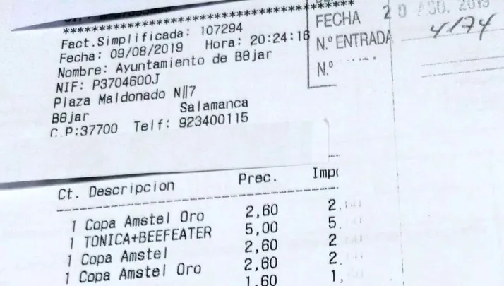 El Partido Popular de Béjar ha denunciado ayer tarde una factura abonada el día nueve de agosto de 2019, por la Concejalía de Cultura del Ayuntamiento de Béjar, en la que se pagan 14 consumiciones de bebidas alcohólicas, entre ellas una copa de ginebra con tónica (Beefeater con Tónica).
