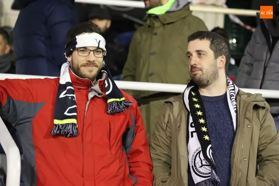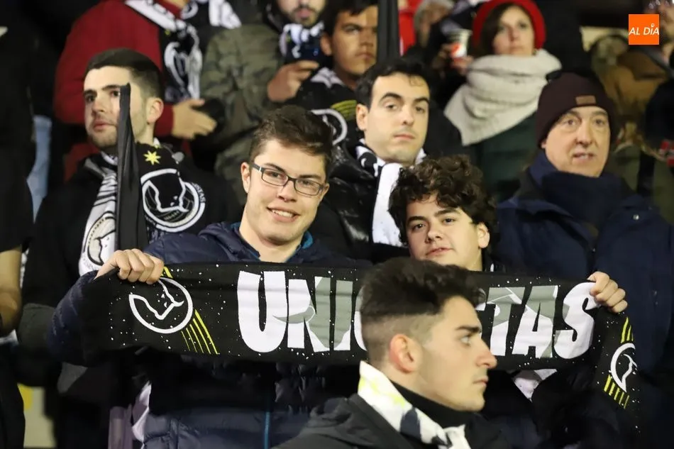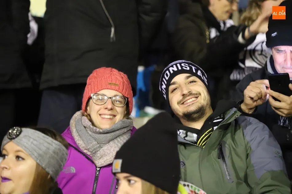 La afición de Unionistas de Salamanca acudió en masa esta tarde a las Pistas del Helmántico para arropar y animar a su equipo en el duelo liguero disputado frente al Barakaldo. El equipo blanquinegro logró la victoria por la mínima gracias a un gol de Guille Andrés que le permite abandonar los puestos de descenso.
