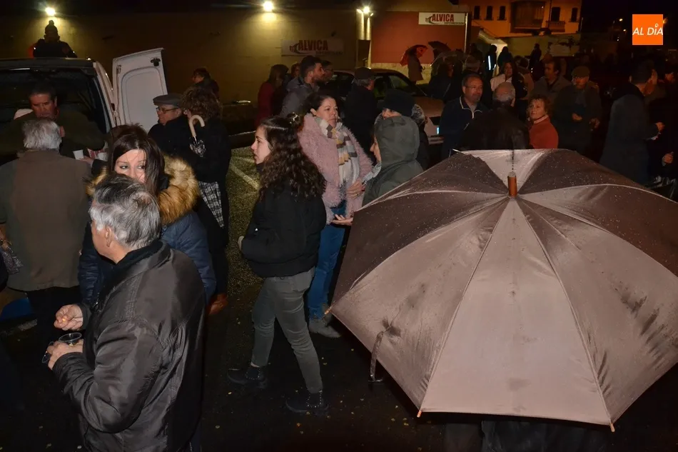 Hasta allí se acercaron, avisados por los cohetes que se lanzaron, un nutrido grupo de mirobrigenses, pese a que la tarde se puso bastante desapacible en el aspecto meteorológico: en los minutos previos a la hora anunciada para el inicio de la hoguera, hizo aparición la lluvia, que sin llegar a caer demasiado fuerte, sí fue yendo y viniendo durante el tiempo en que estuvo ardiendo la leña.