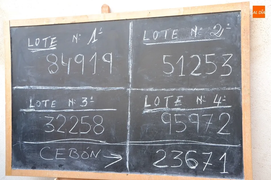 Este año, los lotes recayeron en los números 84.919 (lote 1), 51.253 (lote 2), 32.258 (lote 3), 95.972 (lote 4) y 23.671 (el lote extra, el cebón). Este sorteo fue seguido con atención por la gran mayoría de los fieles que habían asistido a la misa, así como otros cuantos mirobrigenses que acudieron expresamente a ese momento. Tras el sorteo, los presentes se dirigieron al local parroquial para disfrutar de un convite.