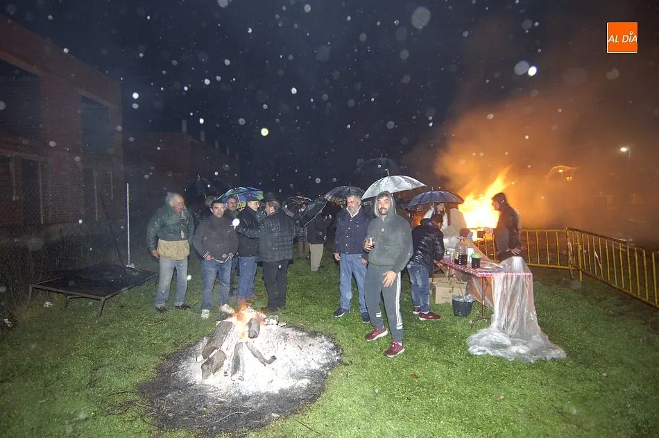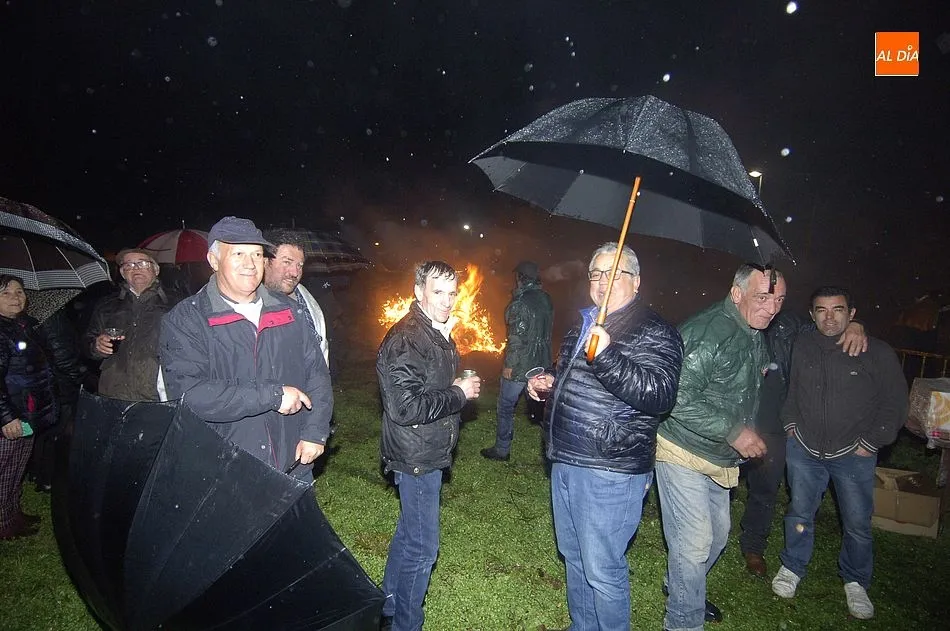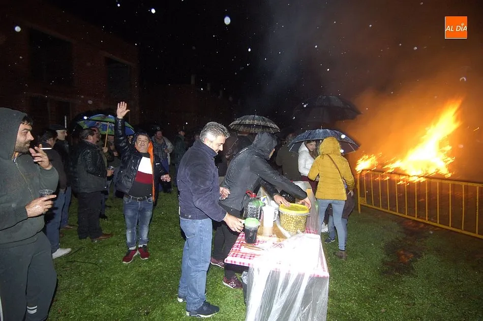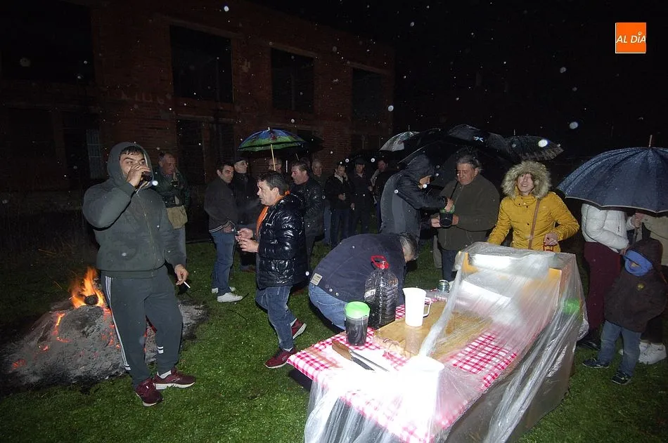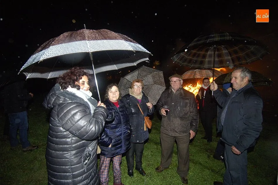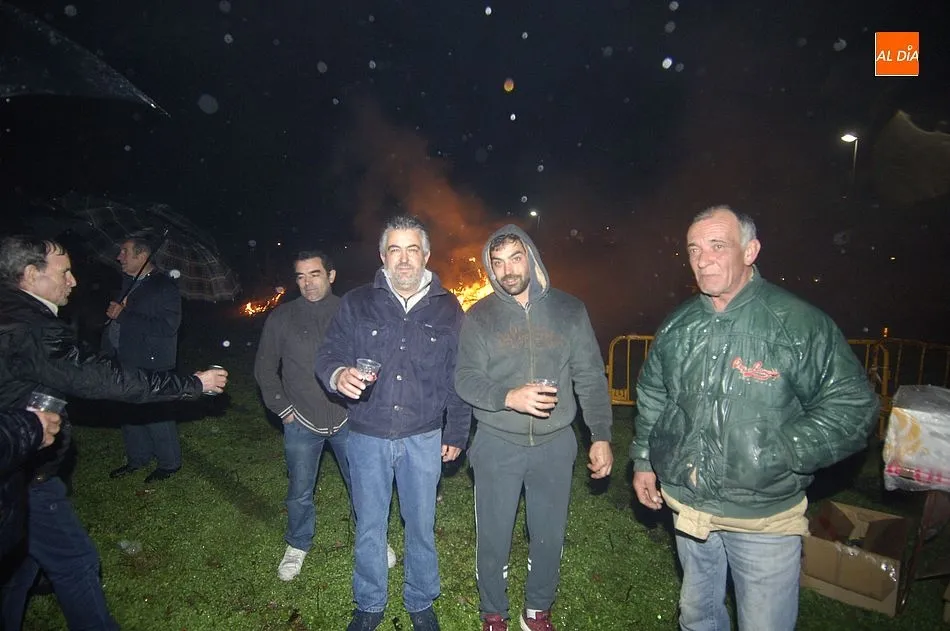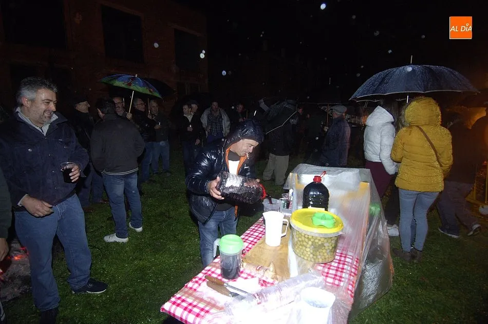 Pese a la lluvia, y también el viento que hacía, unas cuantas personas se congregaron en torno al fuego para intentar calentarse, al mismo tiempo que se repartía la panceta, así como los habituales vino, queso y altramuces de la mano de los mayordomos, Justo y Triana Iglesias.