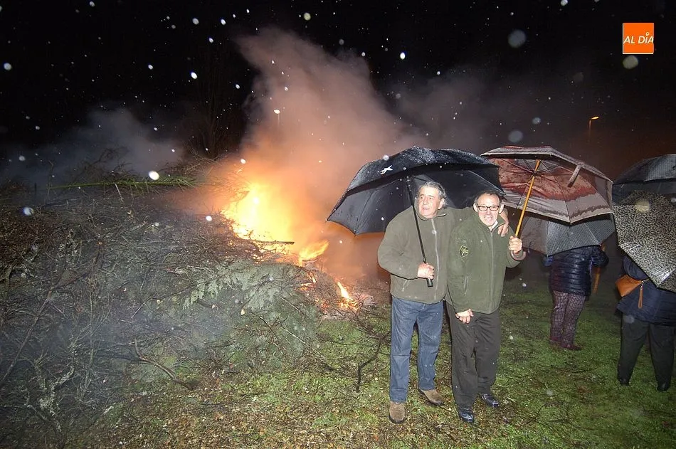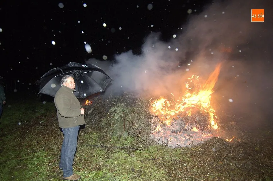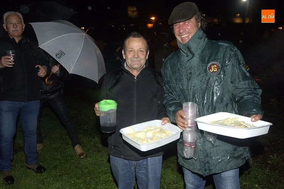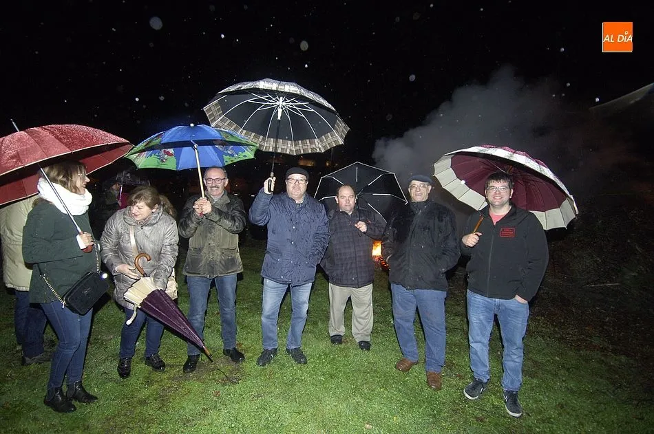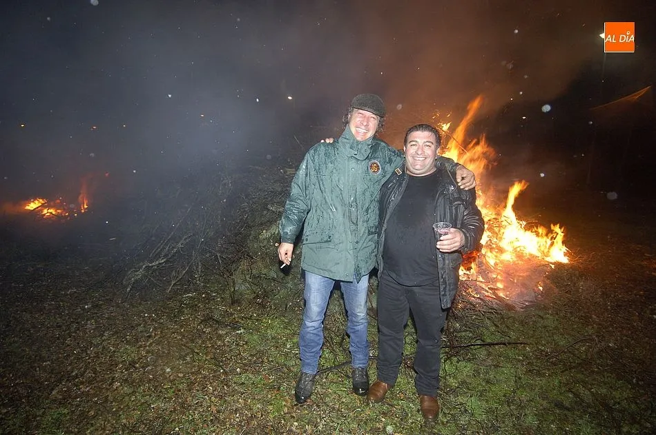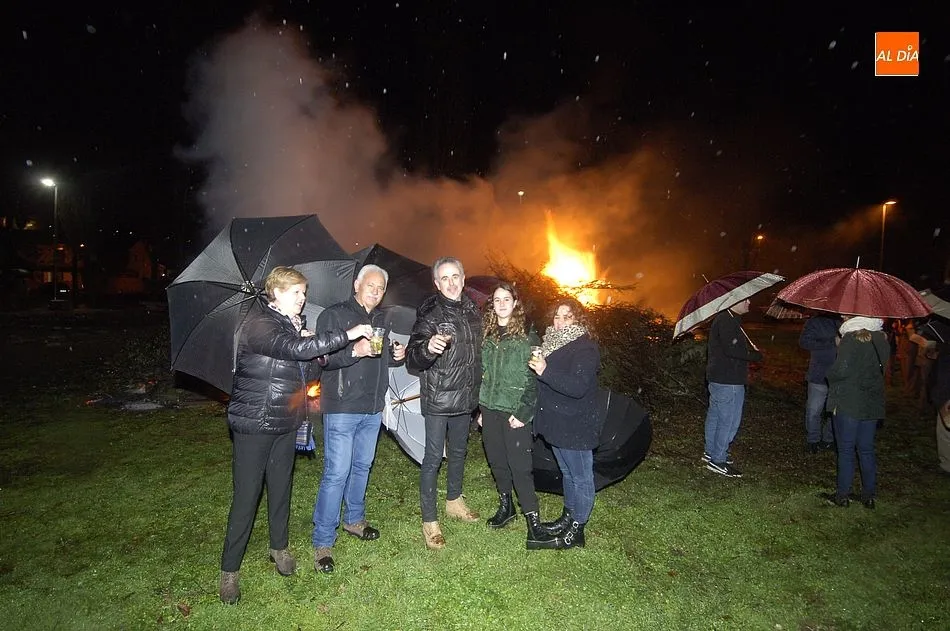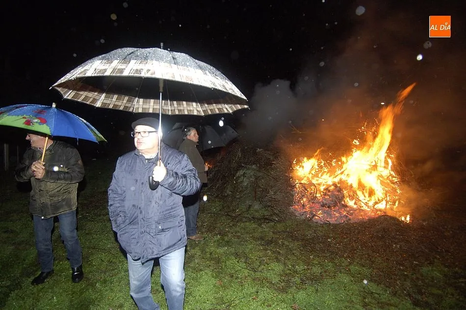 Pese a la lluvia, y también el viento que hacía, unas cuantas personas se congregaron en torno al fuego para intentar calentarse, al mismo tiempo que se repartía la panceta, así como los habituales vino, queso y altramuces de la mano de los mayordomos, Justo y Triana Iglesias.