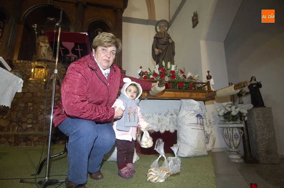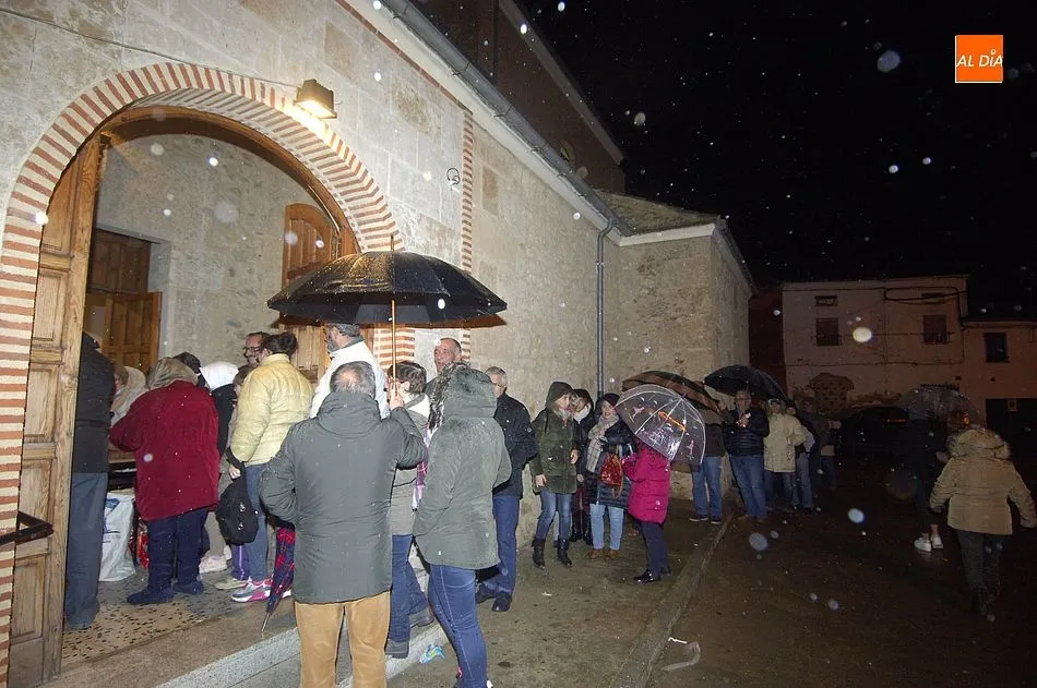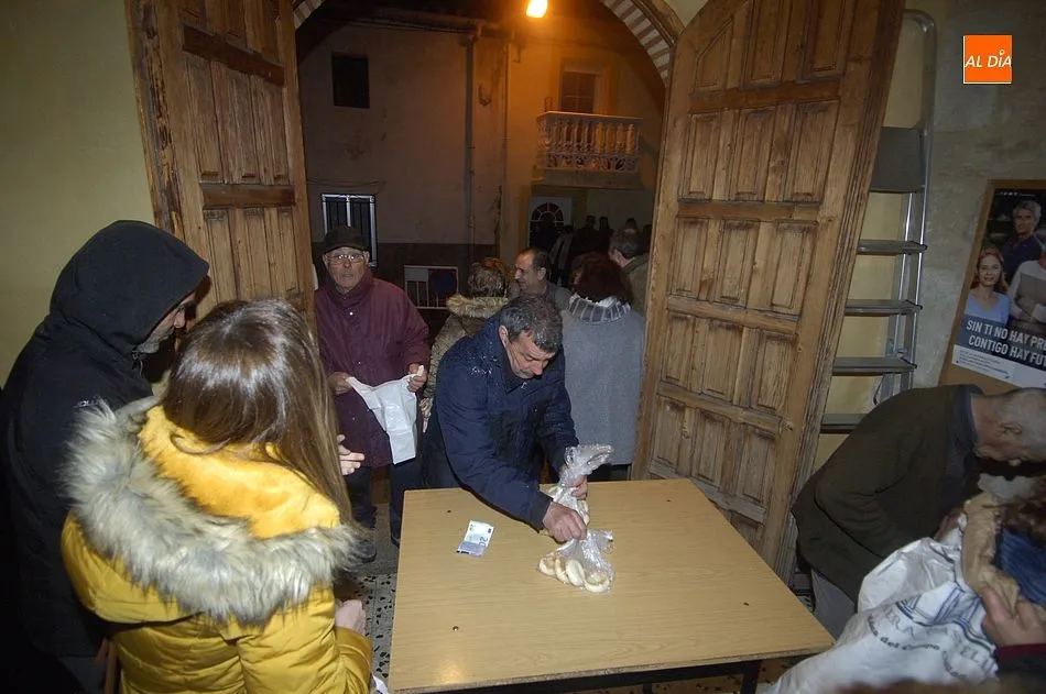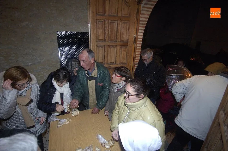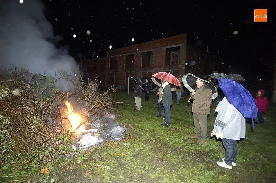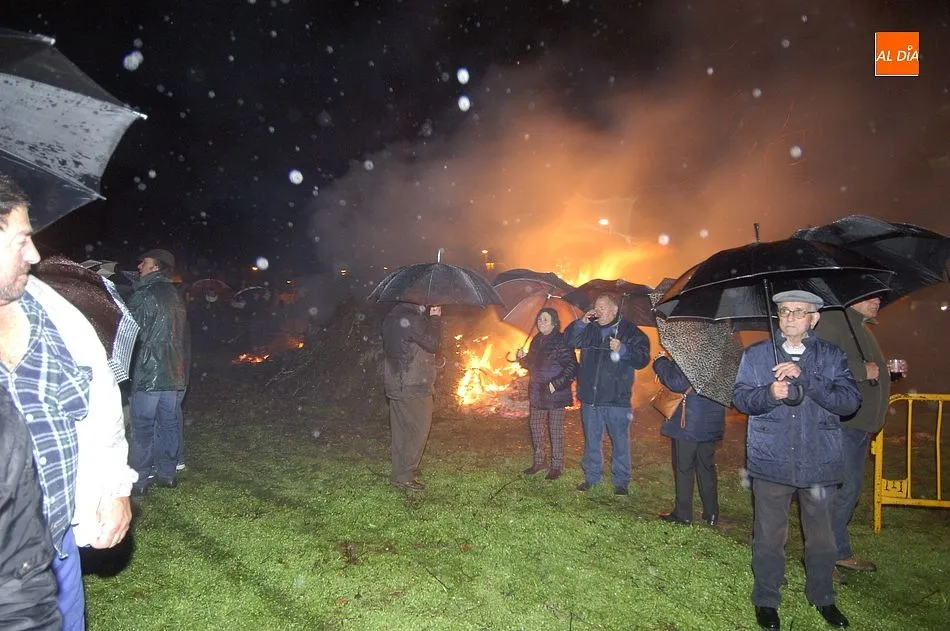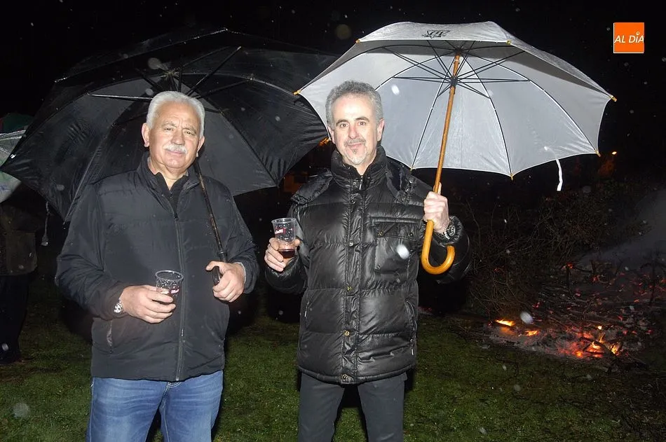 Pese a la lluvia, y también el viento que hacía, unas cuantas personas se congregaron en torno al fuego para intentar calentarse, al mismo tiempo que se repartía la panceta, así como los habituales vino, queso y altramuces de la mano de los mayordomos, Justo y Triana Iglesias.