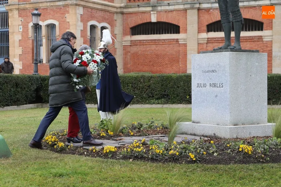 El Ayuntamiento y la Federación de Peñas Taurinas de Salamanca han celebrado este sábado el tradicional homenaje al matador de toros Julio Robles, que coincide con el décimo noveno aniversario de su fallecimiento. El reconocimiento ha tenido lugar junto a la estatua que recuerda al diestro, obra del artista Salvador Amaya, a las puertas de la Plaza de Toros de La Glorieta.