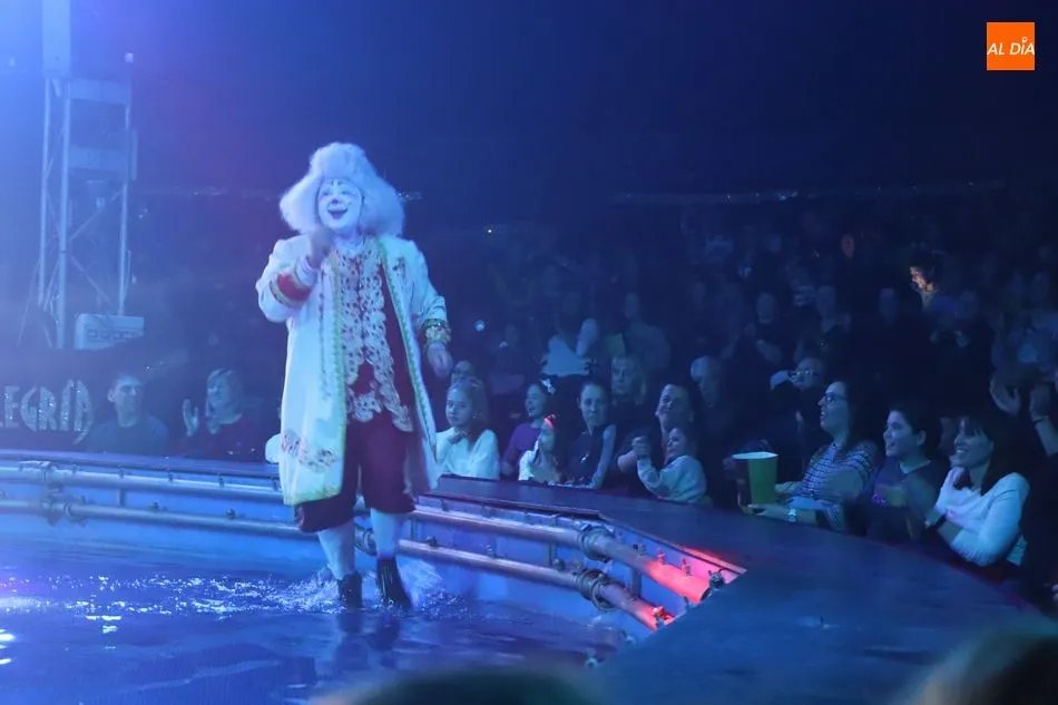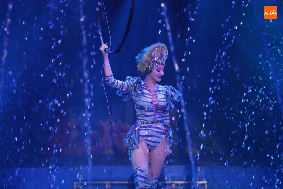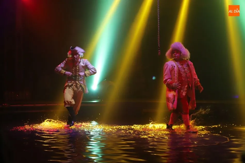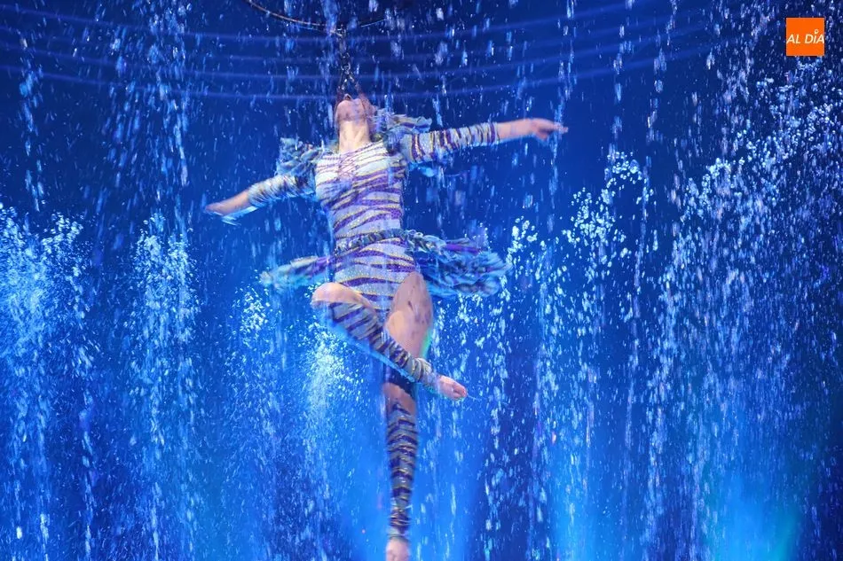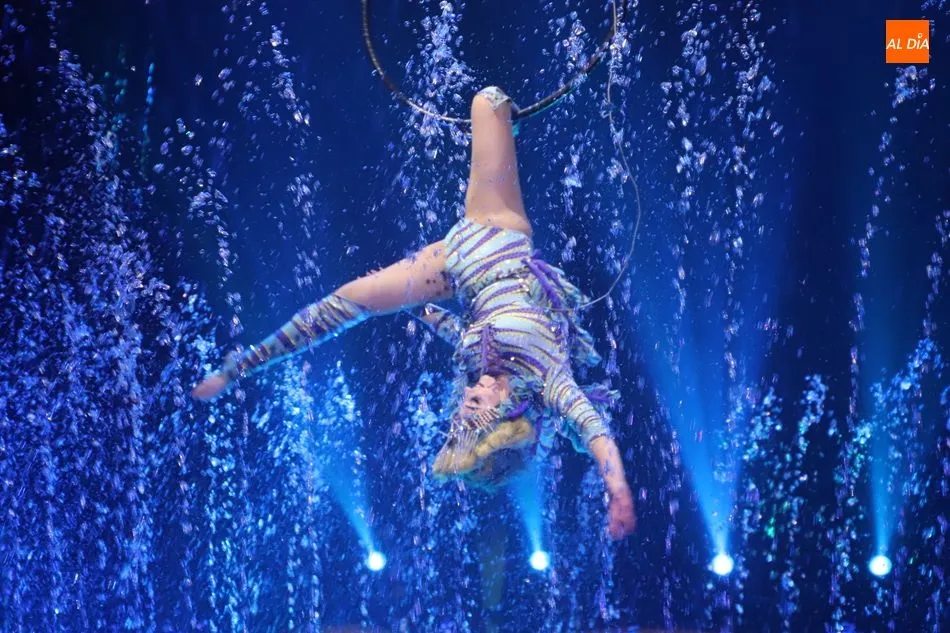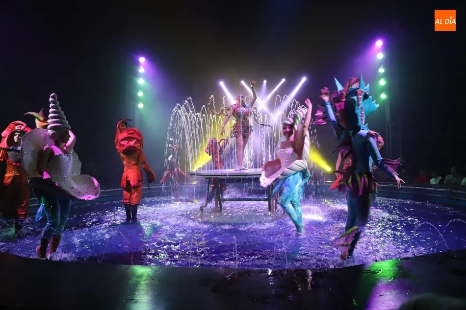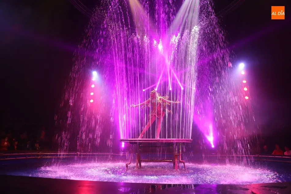 El Circo sobre Agua, un reto para las artes escénicas, ha hecho las delicias del público asistente al espectáculo que por primera vez recalaba en Salamanca, en la gran carpa climatizada del Circo Alegría instalada en el CC El Tormes. Un espectáculo que combina música, voz en directo, efectos especiales de iluminación y las fuentes de agua bailando al compás de las notas musicales.