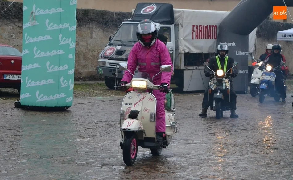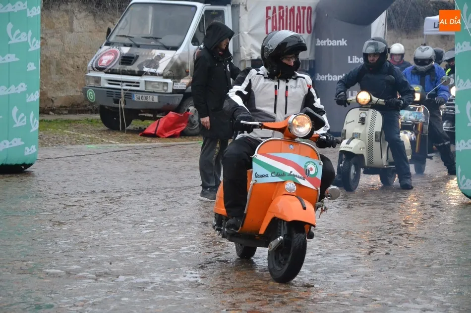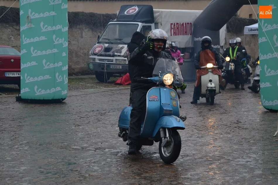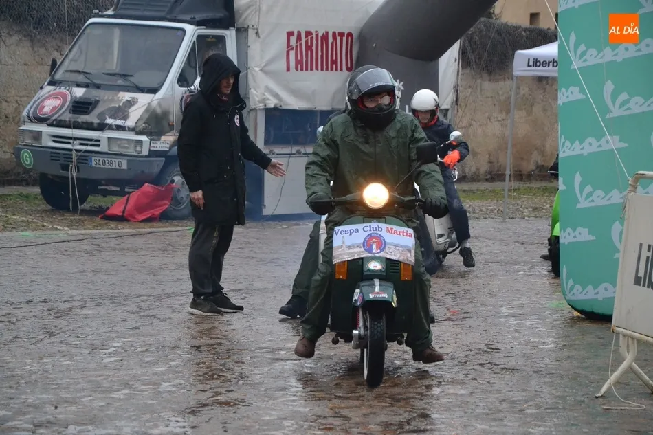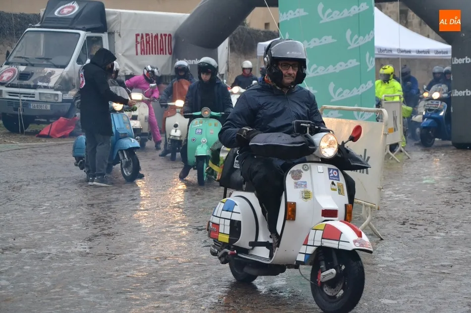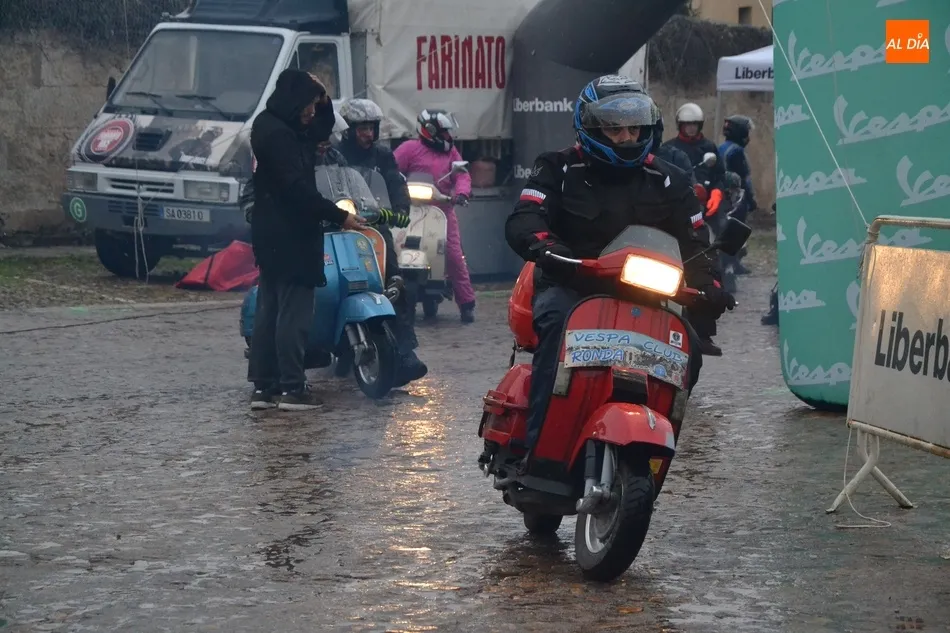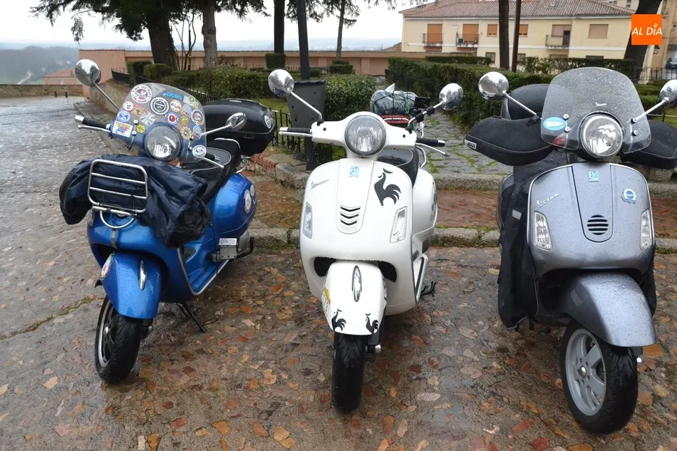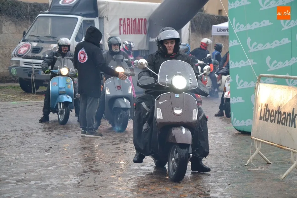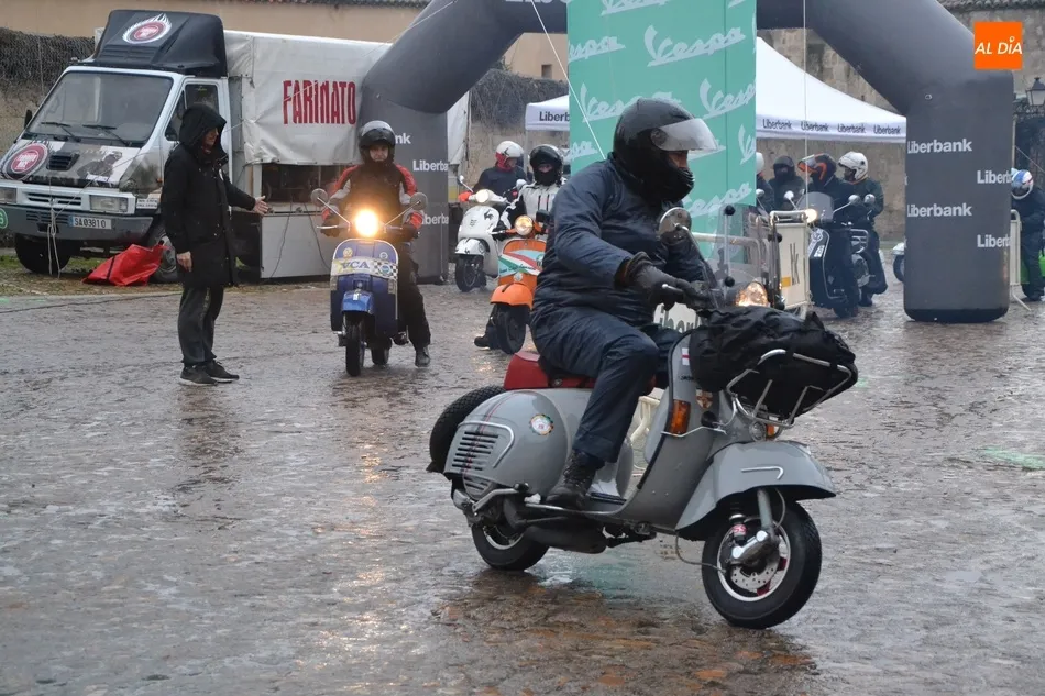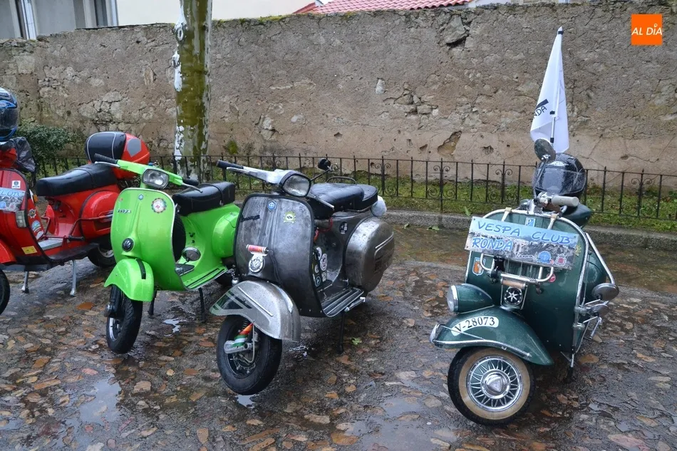 Bajo la lluvia con la que ha amanecido Ciudad Rodrigo este último sábado del mes de enero, unas 35 Vespas se pusieron en marcha a primera hora de la mañana en la Plazuela del Castillo rumbo a La Covatilla, en el marco del encuentro de Vespas CovaDouro del que es epicentro Miróbriga este fin de semana. El encuentro, organizado por el Vespa Club de Salamanca y Custom Classic Scooters, comenzó en la tarde-noche del viernes, con la llegada a Ciudad Rodrigo de los primeros participantes.
