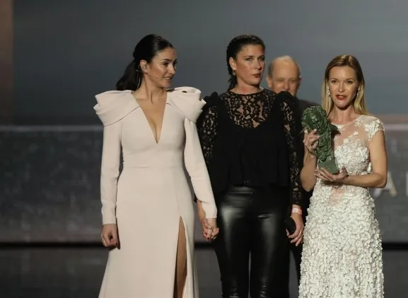 María Esteve, Celia Flores y Tamara Flores se han subido al escenario del Palacio Martín Carpena de Málaga para recoger el Goya de Honor que la Academia ha entregado a su madre, la actriz y cantante Pepa Flores.