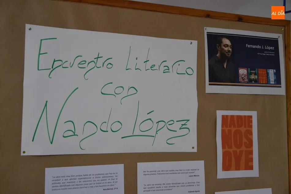 El IES Fray Diego Tadeo de Ciudad Rodrigo recibió en la mañana del lunes la visita del prestigioso escritor Nando López, del cual los alumnos de varios grupos han estado leyendo dos de sus novelas, que han conectado ampliamente con el público adolescente por los temas que trata y por cómo los trata: Nadie nos oye, que han leído los alumnos de 4º de la ESO; y Malditos 16, que han devorado los de 1º de Bachillerato.