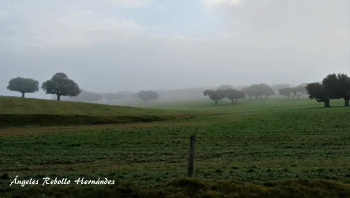 ?Hay aquí una permanencia de lo esencial -cielo, tierra, encinas de hoja perenne-, envuelto en esta niebla de invierno, que solo vela en parte la manifestación de la naturaleza...? (José Luis Puerto) / Foto de Ángeles Rebollo