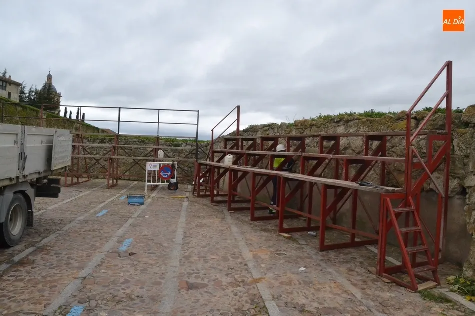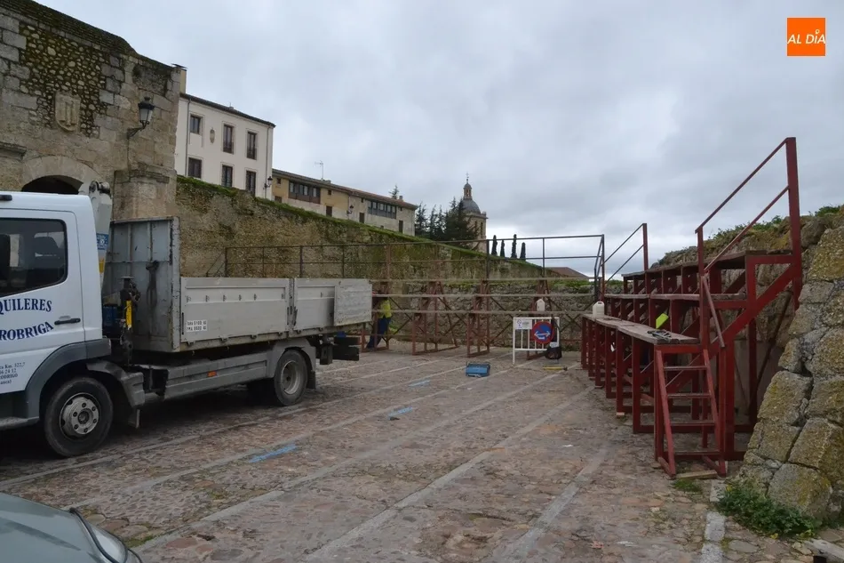 Por otro lado, ya se han instalado las agujas de baja altura de ese muro lateral del Registro, arrancando también durante la mañana del jueves los trabajos a ras de suelo, con el montaje de las dos gradas del espacio. Este Carnaval no será uno más para el Registro, ya que tendrá más protagonismo del habitual, gracias a la ampliación de contenidos del Domingo de Piñata con el que se rematarán las fiestas grandes de Miróbriga el 1 de marzo.