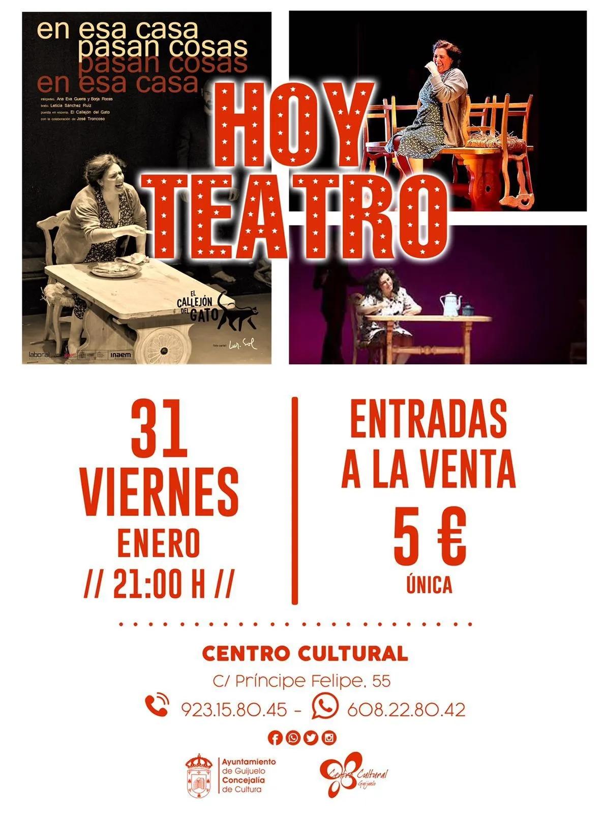 El teatro del centro cultural de Guijuelo acoge esta tarde la primera función del año 2020. La compañía El Callejón del Gato ofrece esta tarde la obra ?En esa casa pasan cosas?. Se trata de una idea original y dramaturgia de Ana Eva Guerra y Moisés González, texto de Leticia Sánchez Ruiz y colaboración para montaje de José Troncoso, trata de manera simbólica la Guerra Civil española y la dura posguerra, a través de la disgregación de una familia.