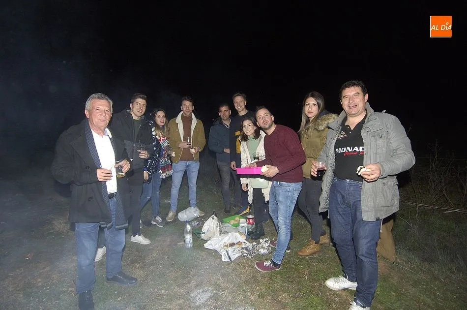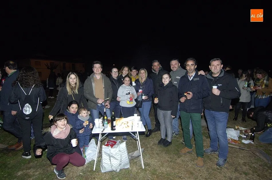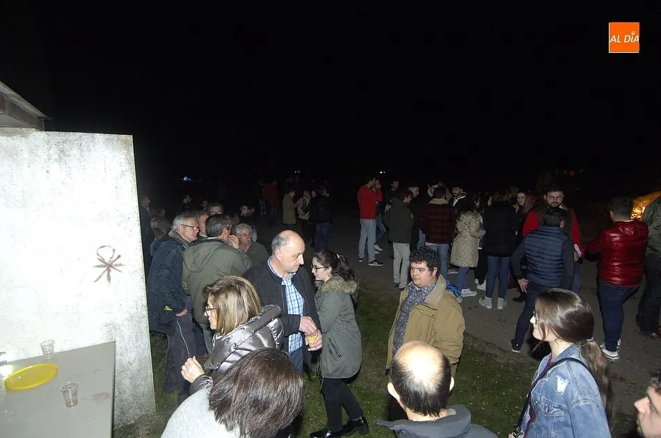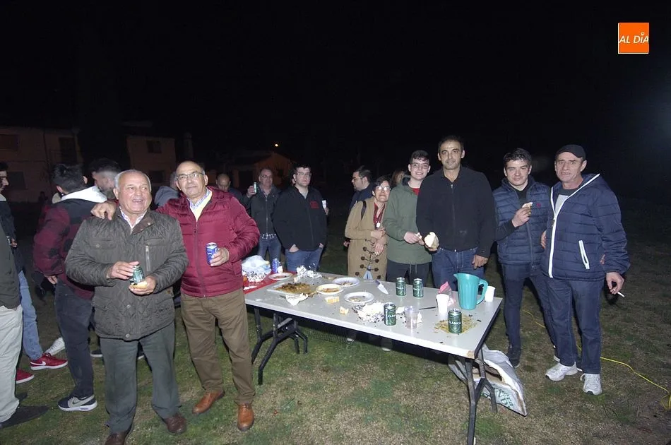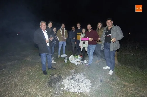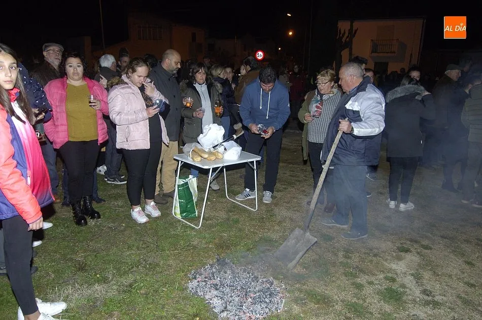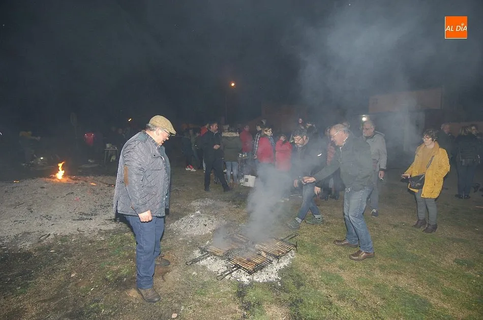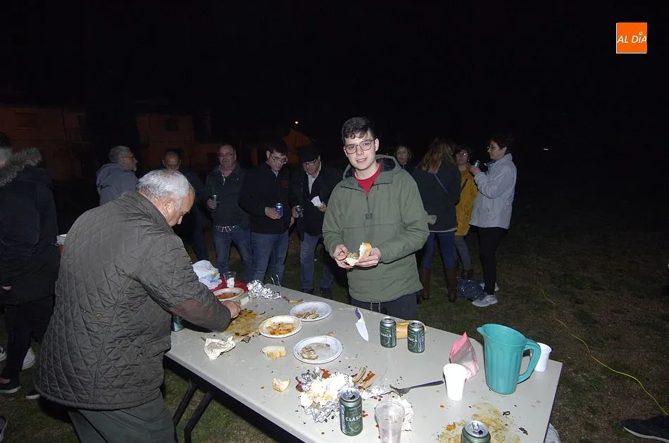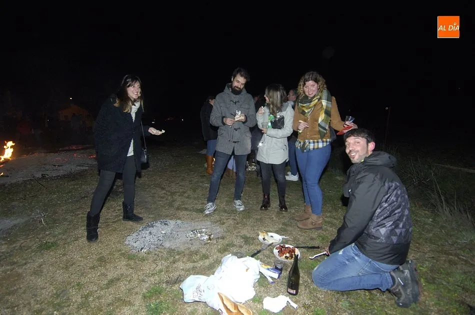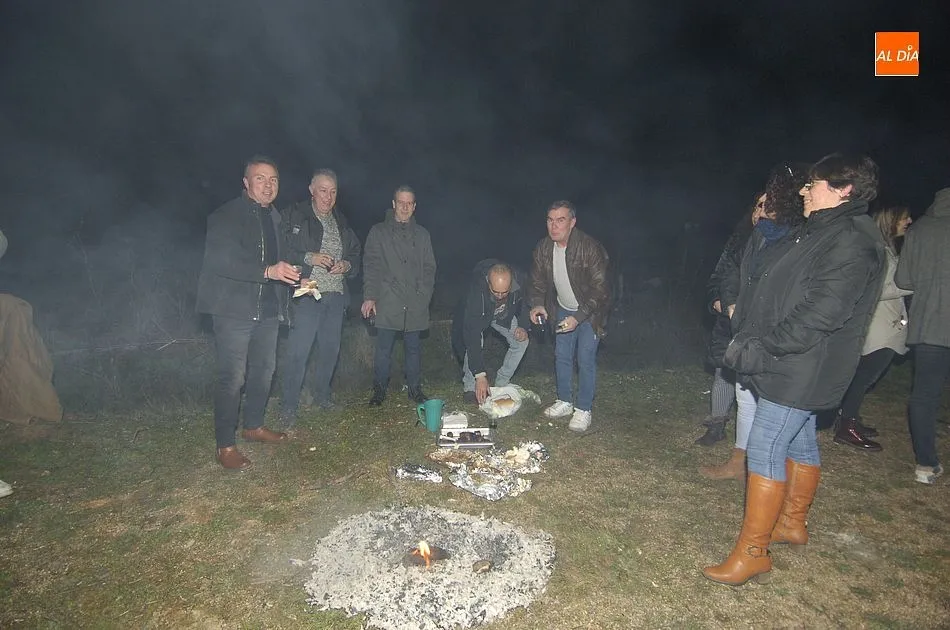 Tras consumirse la leña y quedar las brasas, con una pala los asistentes se preparaban sus mini hogueras alrededor de la principal, para utilizarla de brasero y a la vez para asar los víveres que cada uno había llevado, por lo general, chorizos, morcillas, panceta? todo acompañado de buenos vinos de la tierra, excepto para los conductores, que existe un agua exquisita también proveniente de esta maravillosa tierra.