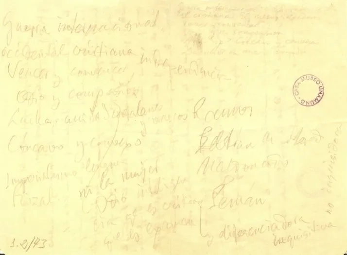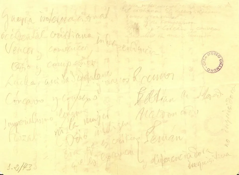 El reverso de esa misiva contiene una parte de la historia de España, las notas manuscritas del discurso del viejo rector en el Paraninfo aquel 12 de octubre de 1936