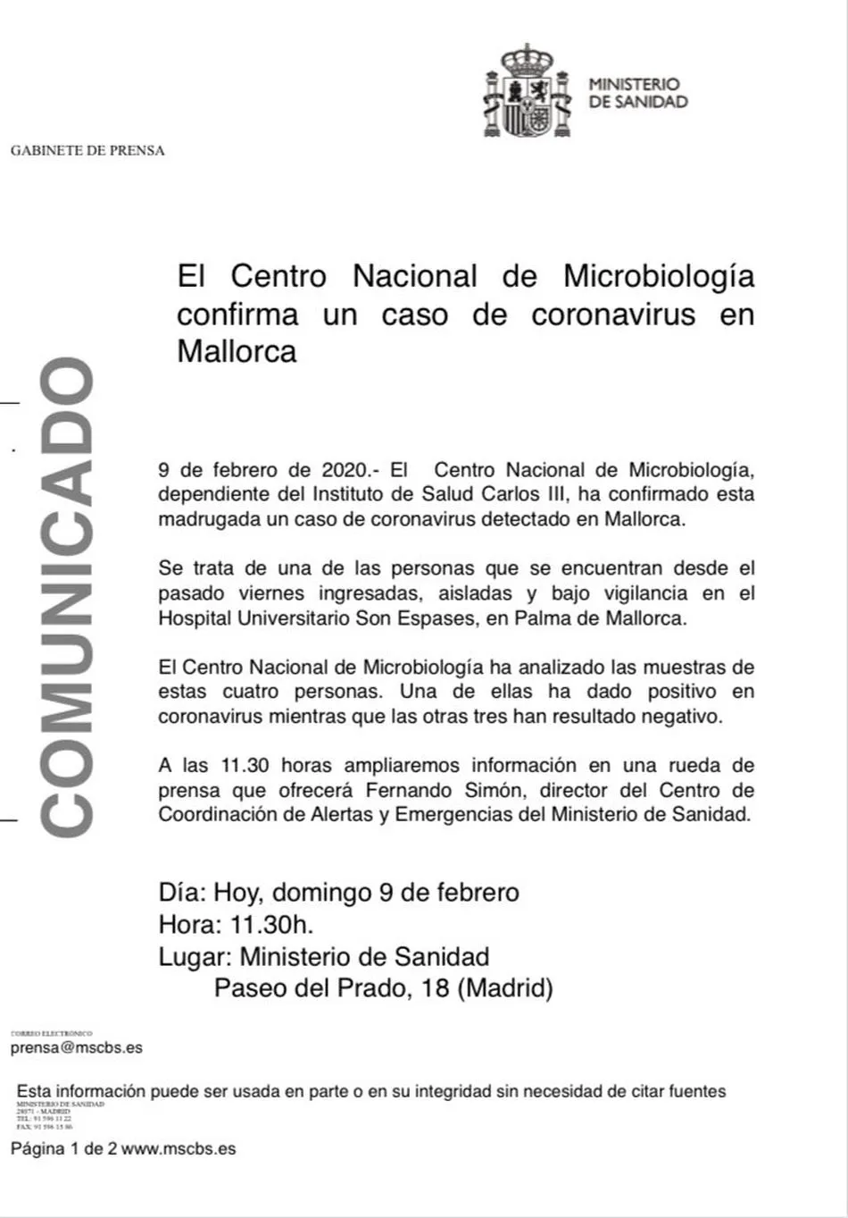 El Centro Nacional de Microbiología confirma un caso de #coronavirus en Mallorca