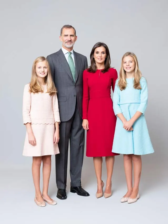 Tanto la Princesa Leonor como la infanta Sofía posan con los mismos estilismos que llevaron durante la última celebración del Día de la Hispanidad. En el caso de Leonor se trata de un conjunto de tweed en rosa palo, mientras su hermana luce un vestido de corte similar y en el mismo tejido pero de color azul. Ambas llevan bailarinas, el que está comprobado que es su calzado favorito.