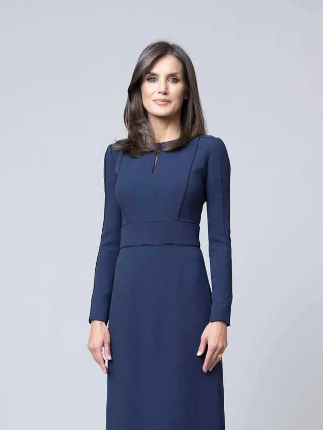 Para el retrato civil Doña Letizia ha optado por un look mucho más discreto. Confiando también en Carolina Herrera, la mujer de Felipe VI luce un vestido sobrio con escote cerrado con una discreta abertura en forma de lágrima, de manga larga, ajustado a la cintura y por debajo de la rodilla. Mientras en las imágenes en solitario y al lado del Rey luce el vestido en color azul marino, en la imagen en la que aparece al lado de su hija lo luce en rojo. Un diseño que ya llevó durante los Premios Princesa de Asturias, lo que significó el debut de la Princesa Leonor. Lo ha combinado, igual que en esa ocasión, con unos salones de color beis también de Carolina Herrera.