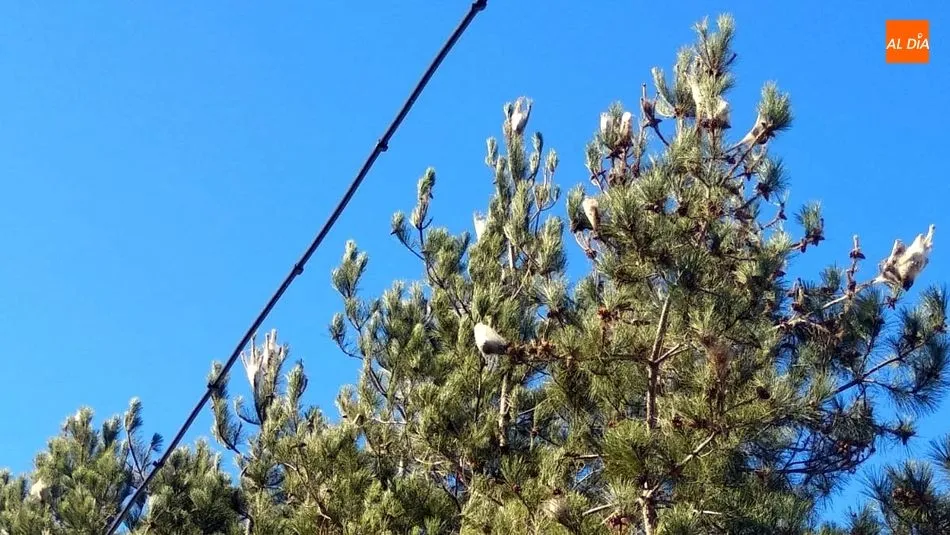 Los Bomberos del Parque Comarcal de Lumbrales, avisados desde la central de bomberos de la Diputación de Salamanca, se han desplazado esta mañana a la localidad de Bañobárez para retitar varios nidos de oruga Procesionaria de unos pinos situados en el casco urbano. Ayudados del brazo articulado del vehículo perteneciente al parque lumbralense, el equipo de bomberos fue accediendo a cada uno de los pinos y retirado todos los nidos existentes, y así evitar daños a los vecinos de la localidad, niños y mayores que pasean y juegan en el cercano parque público.