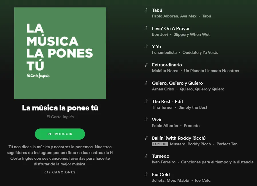 El Corte Inglés ha lanzado ?La música la pones tú?, una campaña para que sus seguidores de Instagram elijan las canciones que quieren que suenen en los centros comerciales de la compañía. La iniciativa, que ha tenido una gran acogida, ha conseguido, en menos de un mes, recopilar más de 1.000 peticiones que han sido agrupadas en una lista de Spotify que lleva el nombre de esta campaña.