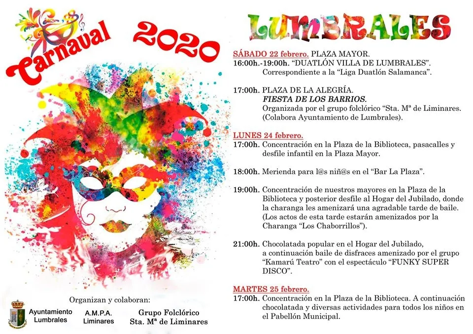 Lumbrales se prepara para celebrar los Carnavales del 2020 con actos para los vecinos de todas las edades y actividades variadas. El programa, elaborado por el Ayuntamiento, el AMPA Liminares y el Grupo Folclórico Santa María de Liminares, recoge la exhibición de folclore charro en la fiesta de ?Los Barrios?, el ?I Duatlon Villa de Lumbrales?, dos jornadas de actividades lúdicas para los niños, una fiesta para los Mayores y un baile de disfraces para todos los públicos, una novedad en la noche del Lunes de Carnaval, el día grande de las Carnestolendas en Lumbrales.
