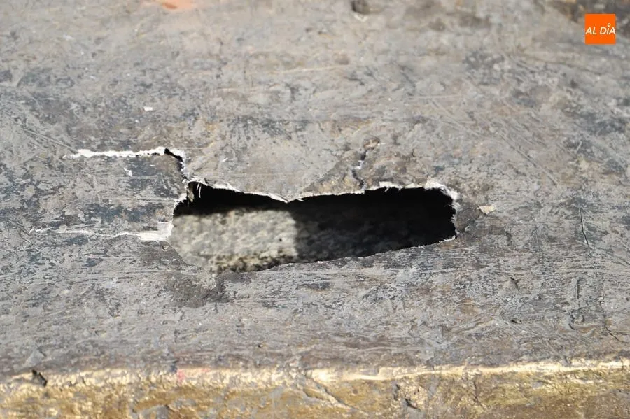 Un agujero en la peana de la escultura ?Tierra soleada?, de Xu Hongfei, que se encuentra en la Plaza Mayor, ha sorprendido hoy a los viandantes.