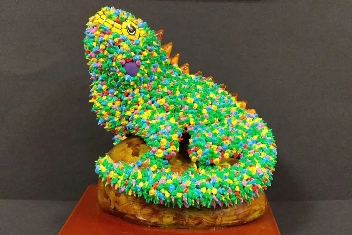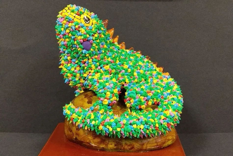 Una escultura de una iguana multicolor procedente de Ecuador, el último de los presentes recibidos este año