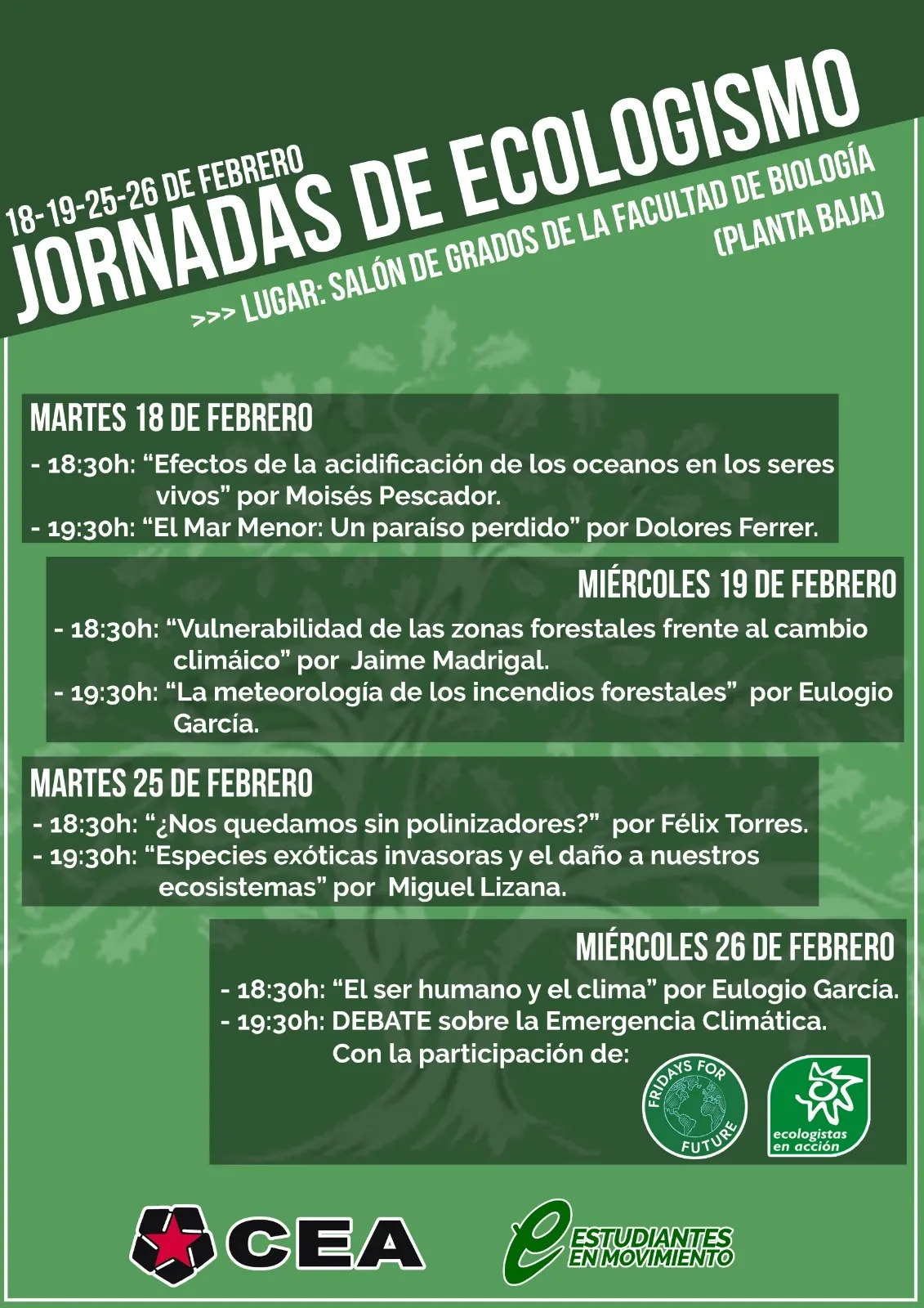 ?Con estas jornadas pretendemos abordar los diferentes problemas que actualmente sufre nuestro planeta como consecuencia de la crisis climática existente, desde una perspectiva científica y seria? indican desde la asociación estudiantil. Por otra parte, añaden: ?Tampoco nos hemos querido olvidar de las asociaciones ecologistas de nuestra ciudad, y por ello en una de las charlas reflexionaremos y debatiremos con ellos sobre cómo se puede combatir el cambio climático?.