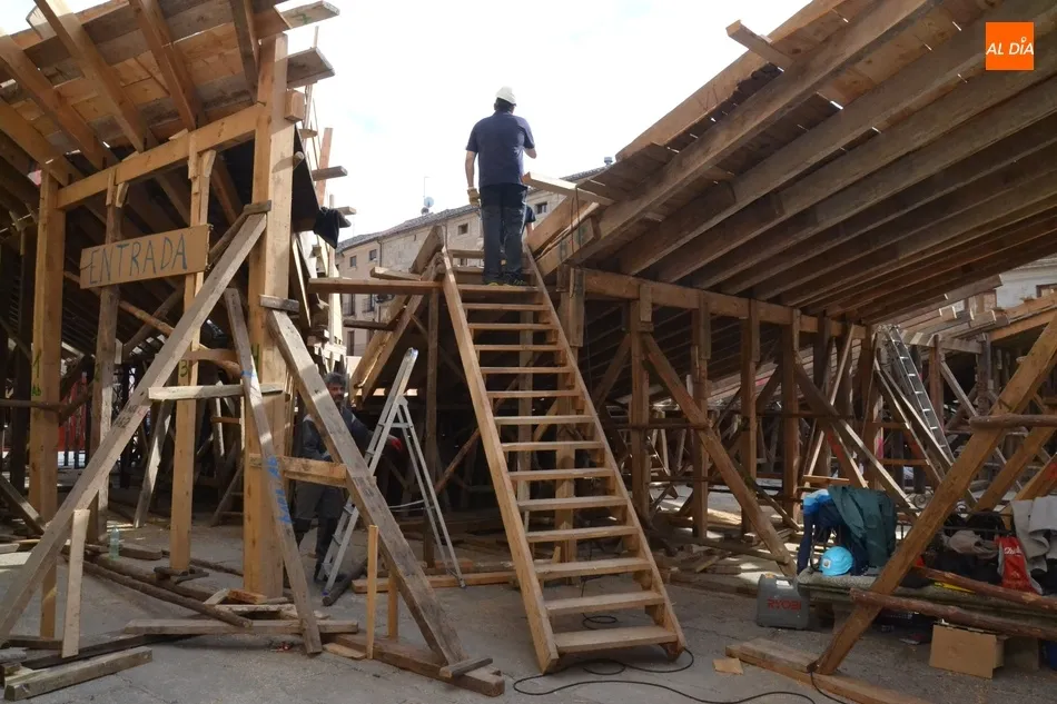 Como se puede ver en las imágenes de esta información, entre los participantes en esa construcción ha estado un año más ?en primera línea? Salvador López Ruiz, homenajeado el pasado miércoles (en el transcurso del acto de presentación de las Coplas de la Rondalla III Columnas) por las décadas que lleva trabajando en el montaje del coso taurino mirobrigense.